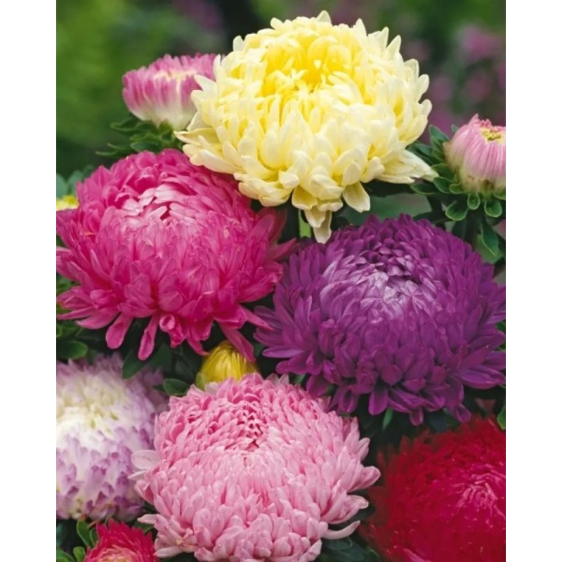 Пестрая цветочная смесь из великолепных густо махровых астр пионовидной формы. Соцветия крупные, диаметром 11-13 см на длинных, прочных цветоносах, сохраняют свою декоративность под воздействием дождя и ветра. Кусты крепкие, ветвистые, высотой 60-70 см. Цветение раннее, обильное и продолжительное. Используются для выращивания на клумбах, в миксбордерах. Отлично подходят для срезки, цветы в воде стоят до 14 дней.