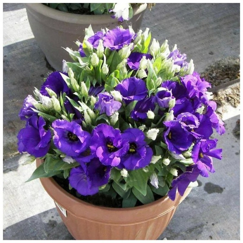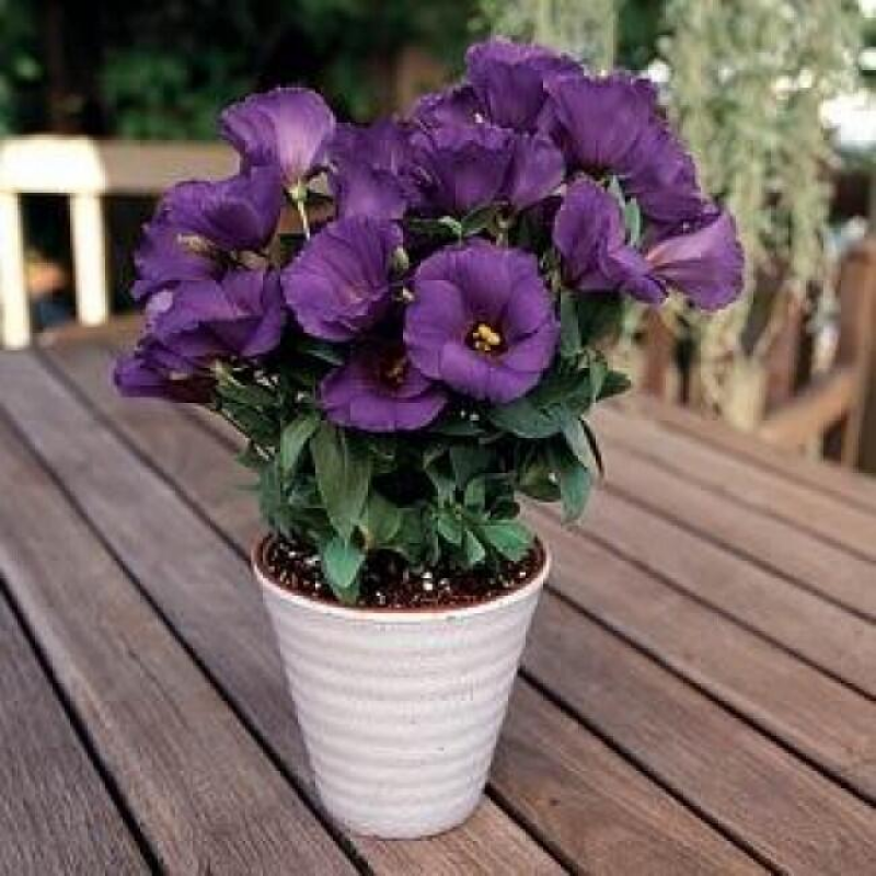 Изумительный по красоте цветок – само совершенство природы! Компактные низкорослые кустики высотой 20-30 см не требуют формирования, хорошо ветвятся и не перерастают. Начиная с июля, на каждом растении постепенно распускается 15-25 крупных цветков диаметром 5-7 см. Эустома хорошо растет в горшках и балконных ящиках с легким плодородным грунтом. Осенью побеги можно обрезать на 2/3 длины и забрать растения в теплое светлое помещение, где через некоторое время они зацветут повторно. В горшок диаметром 10 см достаточно посадить одно растение.