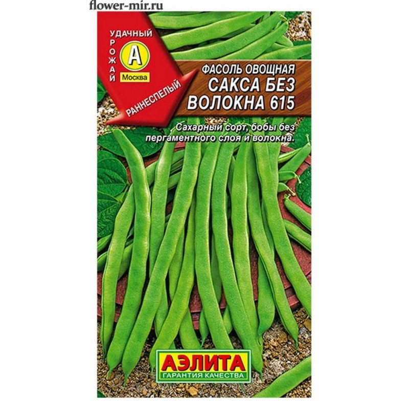 Фасоль Сакса без волокна 615 – вкусный сладкий спаржевый сорт с рано созревающим урожаем! От всходов до первого сбора урожая проходит всего 50 дней. Растение кустовое, высотой 35-40 см. Бобы выровненные, длиной 9-12 см, прекрасных вкусовых качеств, с повышенным содержанием сахаров и витаминов. В створках и швах отсутствует пергаментный слой и волокно. Поэтому приготовленные блюда будут отличаться особенной нежностью вкуса. С подобных сортов очень хорошо приучать детей к вкусной и здоровой пище, ведь они обычно не любят твердые ростки.