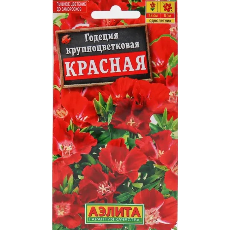 Сорт с уникальной яркой, насыщенной окраской крупных цветков, диаметром 7-8 см, собранных в плотные, объемные соцветия. Цветки потрясающе декоративны благодаря нежным лепесткам с атласным блеском. Растения компактные, прямостоячие, высотой 40-45 см, хорошо кустятся и обильно цветут. Годеция рекомендуется для оформления разнообразных смешанных садовых клумб, бордюров и контейнеров. Срезанные соцветия долго сохраняют декоративность и свежесть в небольших букетах.