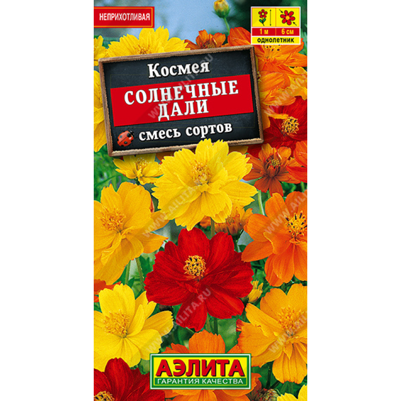 Космея Солнечные дали — яркая смесь сортов для создания живописных цветников. Неприхотливый однолетник с пышными кустами высотой 70-100 см украсит сад обильным и продолжительным цветением. Ажурная листва и многочисленные соцветия диаметром 5-6 см добавляют растению воздушности, идеально подходя для природных ландшафтов и клумб.