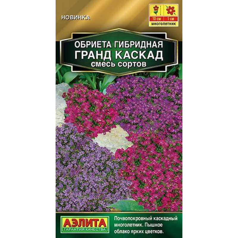 Серия красивоцветущей каскадной обриеты. Это прекрасная почвопокровная многолетняя культура для создания бордюров, украшения каменистых горок и подпорных стенок в саду. Растения высотой около 10 см, диаметром до 40-50 см, зимостойкие. Быстро восстанавливают декоративный облик весной после схода снега и зацветают в мае пышным ковром ярких цветков ? 1 см. Обриета незаменима на каждом участке, потому что пик ее цветения приходится на межсезонье (конец весны), когда отцвели первоцветы, а большинство однолетников и многолетников только формируют бутоны.