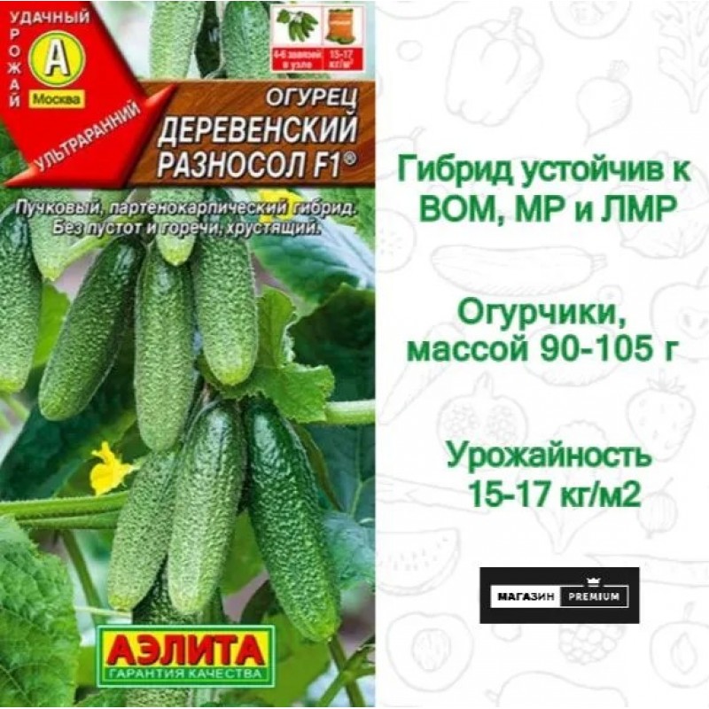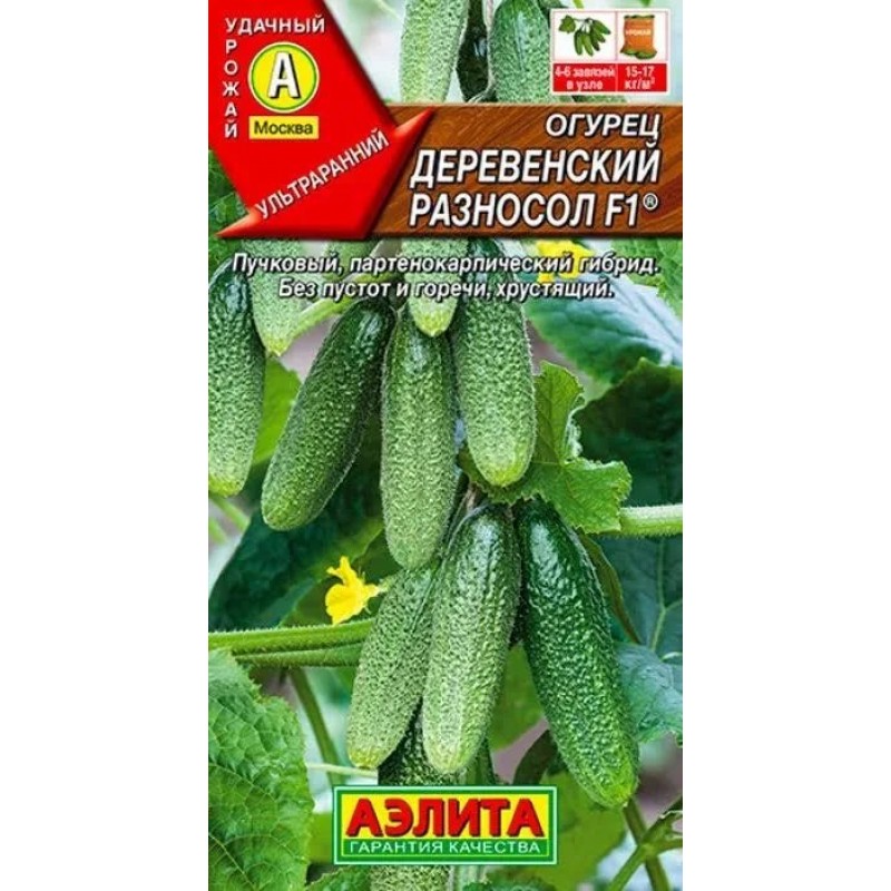 Ультраранний партенокарпический гибрид с букетным типом цветения. От всходов до первого сбора плодов 38-42 дня. Закладывает исключительно женские цветки, по 4-6 шт в узле. Для открытого и защищенного грунта. Зеленцы короткие, длиной 8-10 см, массой 90-105 г. Огурчики отличного вкуса, без горечи. Гибрид устойчив к кладоспориозу, среднеустойчив к ВОМ, МР и ЛМР. Урожайность высокая – 14-15 кг/м2.