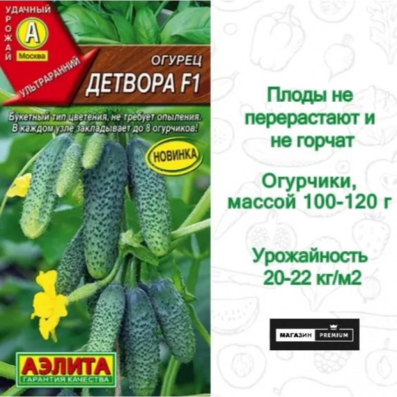 Ультраранний, высокоурожайный партенокарпический гибрид. Первые огурчики снимают через 41-43 дня после всходов. Для пленочных укрытий и открытого грунта. Плодоношение дружное, в каждом узле формируется 5-8 завязей. Зеленцы короткие, массой 100-120 г. Плоды не перерастают и не горчат. Подходит для выращивания пикулей и корнишонов. Урожайность в теплице 20-22 кг/м2.