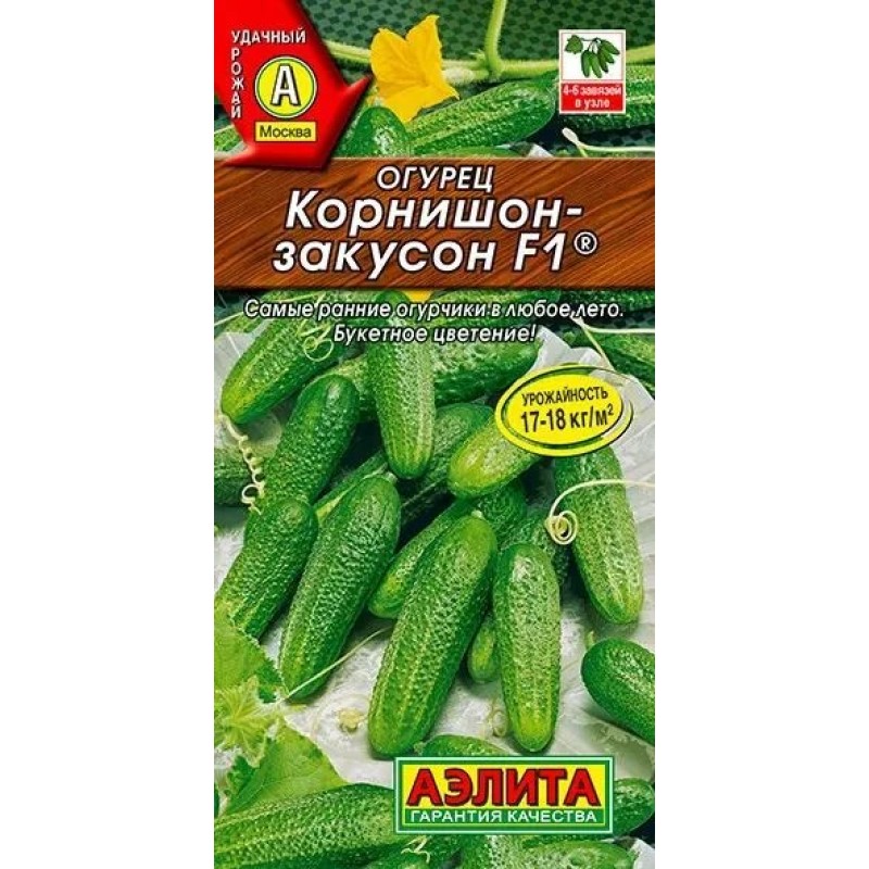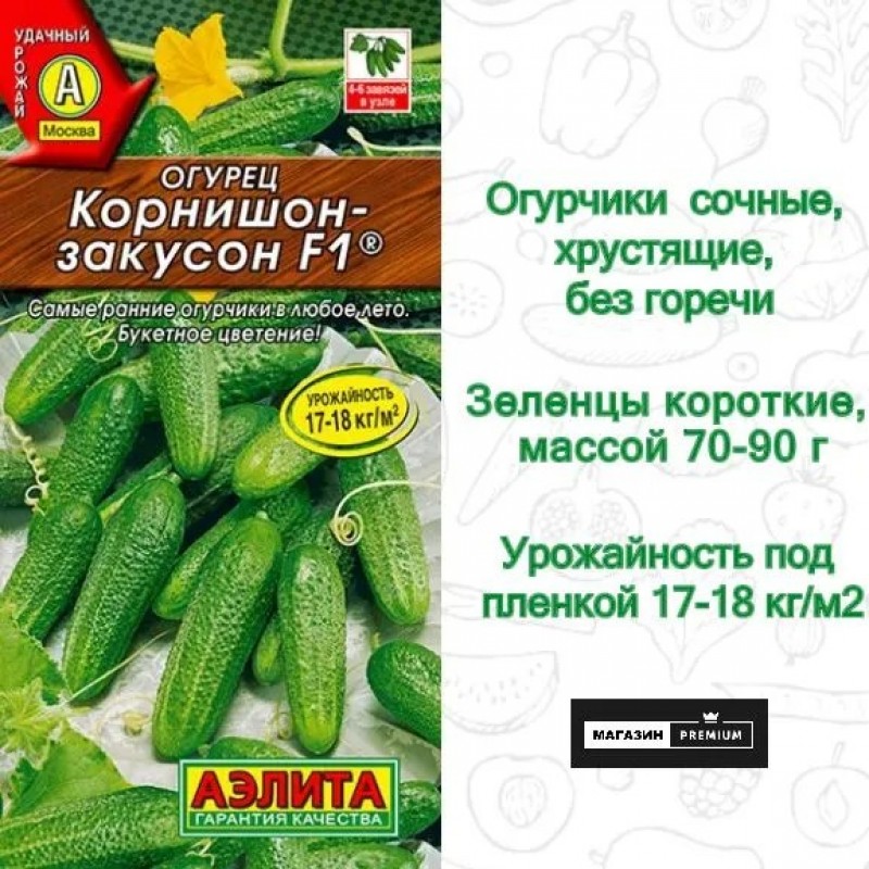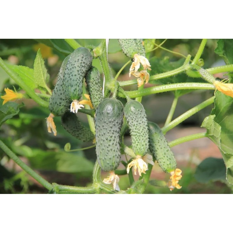 Ультраскороспелый партенокарпический гибрид с букетным типом цветения. Для пленочных укрытий и открытого грунта. Урожай начинают собирать на 38-45 день после всходов. В каждом узле закладывает до 6 завязей. Зеленцы короткие, массой 70-90 г, сочные, хрустящие, без горечи. Идеальны для соления и маринования. Гибрид устойчив к резким колебаниям температуры, что дает возможность получать ранние огурчики в любое лето. Урожайность под пленкой 17-18 кг/м2.
