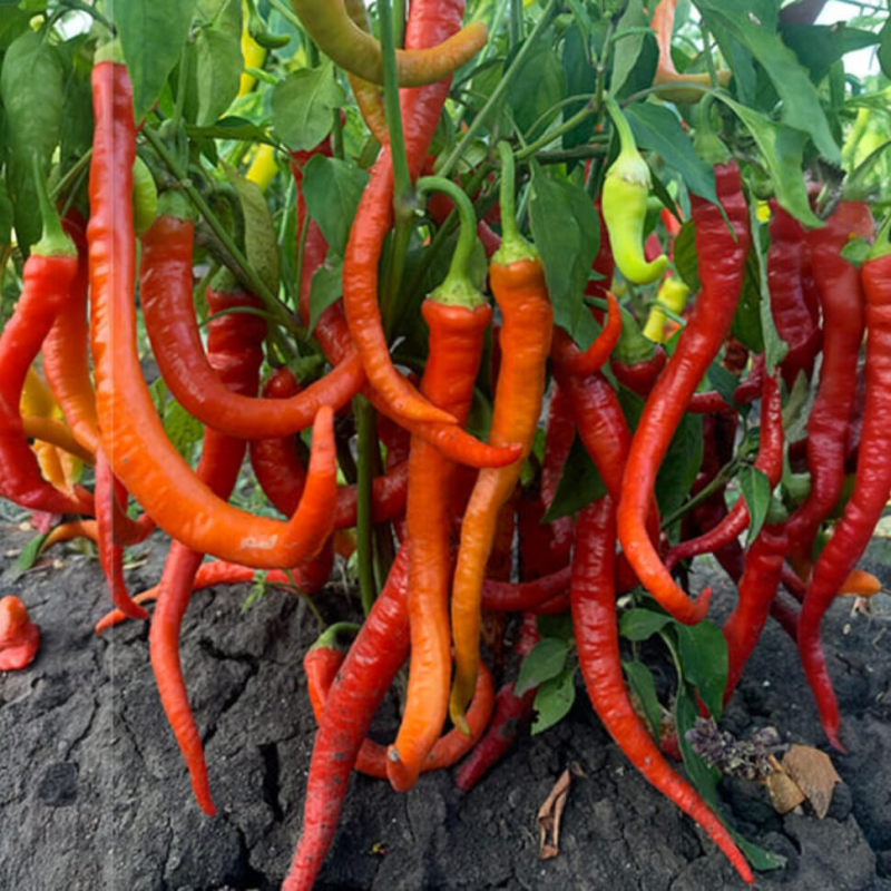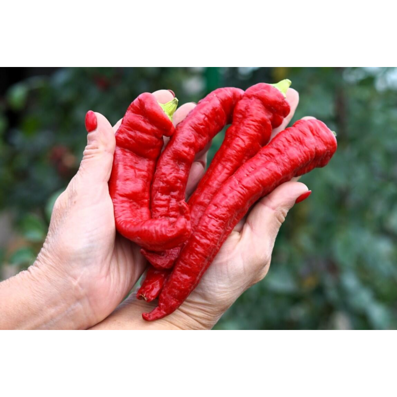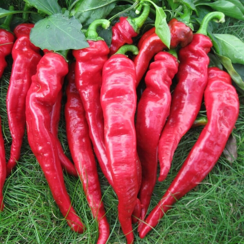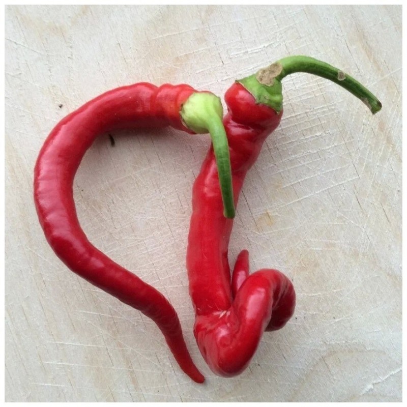 зрывной жгучий вкус – остроты мало не будет! От всходов до потребительской спелости проходит 100-105 дней. Куст высотой 50-60 см. Плоды оригинальной, неповторимой формы, массой 25-35 г. Гигант среди острых сортов – длина перцев до 35 см. Поверхность – глянцевая, толщина стенки 1,5-2 мм. Окраска в технической спелости – зеленая, в биологической – красная. Урожайность до 3 кг/м2. Сорт рекомендуется выращивать в защищенном или открытом грунте. Плоды станут «изюминкой» домашних заготовок, подойдут для приготовления приправ, острых соусов. Зрелые перчинки отлично хранятся, транспортируются благодаря плотной оболочке. Идеальны для декорации кухонных помещений.