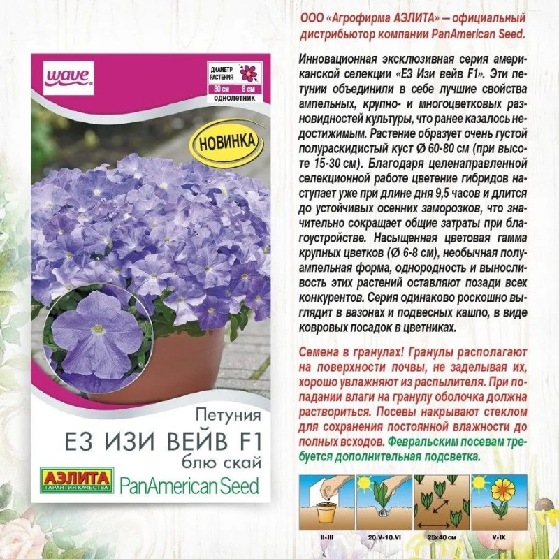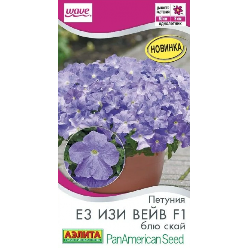 Инновационная эксклюзивная серия американской селекции «Е3 Изи вейв F1». Эти петунии объединили в себе лучшие свойства ампельных, крупно- и многоцветковых разновидностей культуры, что ранее казалось недостижимым. Растение образует очень густой полураскидистый куст диаметром 60-80 см (при высоте 15- 30 см). Благодаря целенаправленной селекционной работе цветение гибридов наступает уже при длине дня 9,5 часов и длится до устойчивых осенних заморозков, что значительно сокращает общие затраты при благоустройстве. Насыщенная цветовая гамма крупных цветков (диаметром 6-8 см), необычная полуампельная форма, однородность и выносливость этих растений оставляют позади всех конкурентов. Серия одинаково роскошно выглядит в вазонах и подвесных кашпо, в виде ковровых посадок в цветниках.