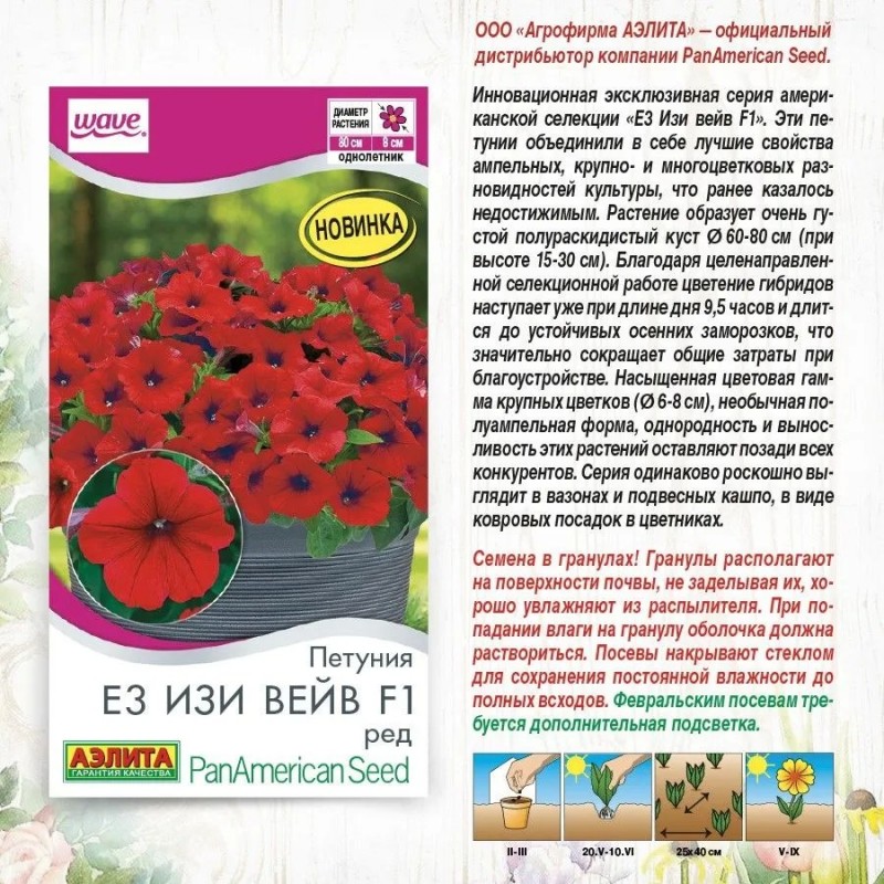 Инновационная эксклюзивная серия американской селекции «Е3 Изи вейв F1». Эти петунии объединили в себе лучшие свойства ампельных, крупно- и много цветковых разновидностей культуры, что ранее казалось недостижимым. Растение образует очень густой полураскидистый куст Ø 60-80 см (при высоте 15- 30 см). Благодаря целенаправленной селекционной работе цветение гибридов наступает уже при длине дня 9,5 часов и длится до устойчивых осенних заморозков, что значительно сокращает общие затраты при благоустройстве. Насыщенная цветовая гамма крупных цветков (Ø 6-8 см), необычная полуампельная форма, однородность и выносливость этих растений оставляют позади всех конкурентов. Серия одинаково роскошно выглядит в вазонах и подвесных кашпо, в виде ковровых посадок в цветниках.