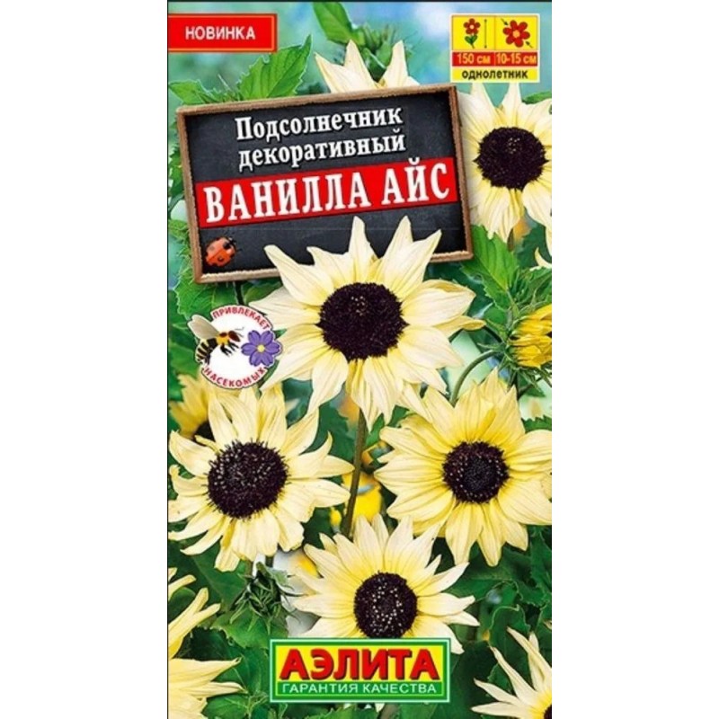 Один из самых красивых декоративных подсолнечников с изумительной кремово-желтой окраской соцветий. Растения с хорошим ветвлением, высотой до 150 см, обильно цветут весь сезон. Соцветия с заостренными лепестками и черной серединкой, диаметром 10- 15 см. Подсолнечник Ванилла Айс отлично смотрится в групповых посадках и миксбордерах на заднем плане. Привлекателен для насекомых-опылителей. Подходит для срезки.
