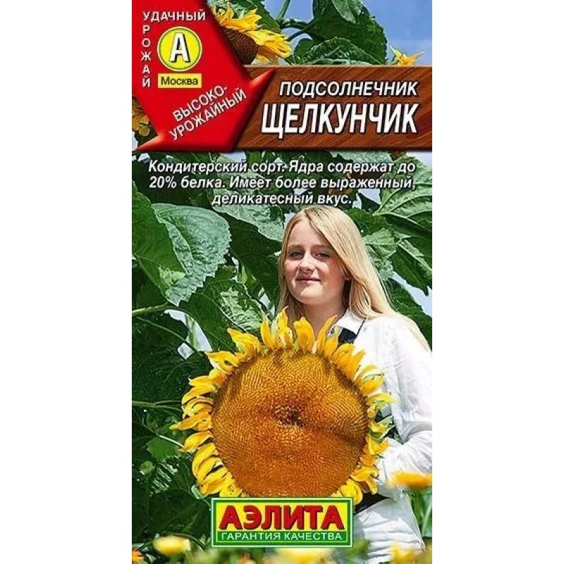 Высокопродуктивный сорт из сегмента кондитерских. Среднеранний, формирует урожай за 85-90 дней от всходов. Растения высокие – 190-210 см, с большими корзинками. Цветение и созревание дружное. Семена крупные (масса 1000 семянок превышает 120 г), хорошо выполненные. Ядра содержат до 20% белка – значительно выше, чем у масличных сортов. Традиционное российское лакомство имеет более выраженный, деликатесный вкус. Растения обладают высокими медоносными и декоративными качествами.