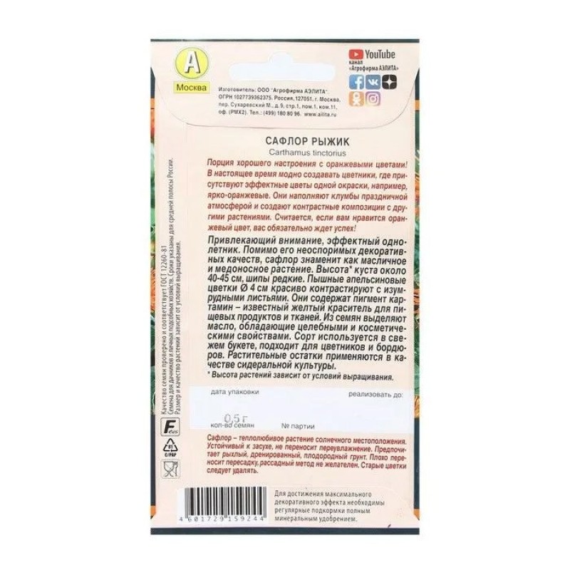 Привлекающий внимание, эффектный однолетник. Помимо его неоспоримых декоративных качеств, сафлор знаменит как масличное и медоносное растение. Высота* куста около 40-45 см, шипы редкие. Пышные апельсиновые цветки диаметром 4 см красиво контрастируют с изумрудными листьями. Они содержат пигмент картамин – известный желтый краситель для пищевых продуктов и тканей. Из семян выделяют масло, обладающие целебными и косметическими свойствами. Сорт используется в свежем букете, подходит для цветников и бордюров. Растительные остатки применяются в качестве сидеральной культуры. * Высота растений зависит от условий выращивания.