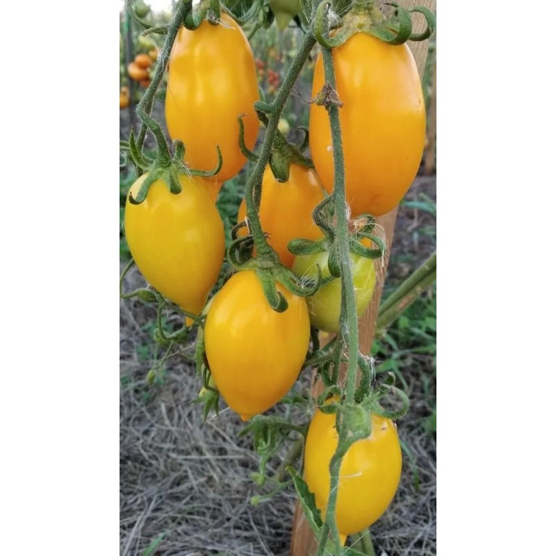 Вкусный скороспелый салатный сорт. Для теплиц и открытого грунта. Высота детерминантных растений в з/г около 1-1,2 м. Завязи собраны в крупные кисти. Плодов образуется настолько много, что кустам необходима надежная подвязка. Период от всходов до получения первого урожая 100-105 дней. Созревание кистей последовательное, плоды не трескаются, не осыпаются. Масса томатов* 50-70 г (отдельные – до 85 г). Они могут быть с носиками или без них. Мякоть кремово-желтая, плотная, нежная, сочная, ароматная. Продукция подходит для заготовок на зиму, хорошо хранится и транспортируется. *Форма плодов может меняться в зависимости от условий.
