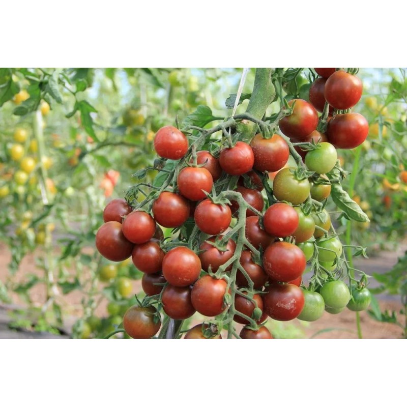 Индетерминантный раннеспелый гибрид. Для парников и теплиц. Период от всходов до начала сбора плодов – 95-100 дней. Высота растений в теплице более 2-х метров. Плоды округлые, массой 35-40 г, по мере созревания меняют цвет от темно-коричневого до красно-коричневого. Томаты собраны в простые кисти, с 7-8 плодами в каждой. Гибрид отличается высокой степенью завязываемости плодов, выравненностью по размеру и массе, устойчивостью к комплексу болезней. Вкусовые качества отличные. Томат прекрасно подходит для уборки целыми кистями. Урожайность 15-17 кг/м2.