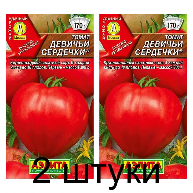 Отличный среднеспелый сорт для теплиц и открытого грунта. Первые плоды созревают через 111-115 дней от появления всходов. Растения индетерминантные, образуют до 10 плодов в каждой кисти. Плоды сердцевидные, крупные, сахарные на разломе, средней массой 150-170 г. Первые томаты достигают 300 г. Назначение сорта: для приготовления салатов и соков. Урожайность в теплице – 9-12 кг/м2.