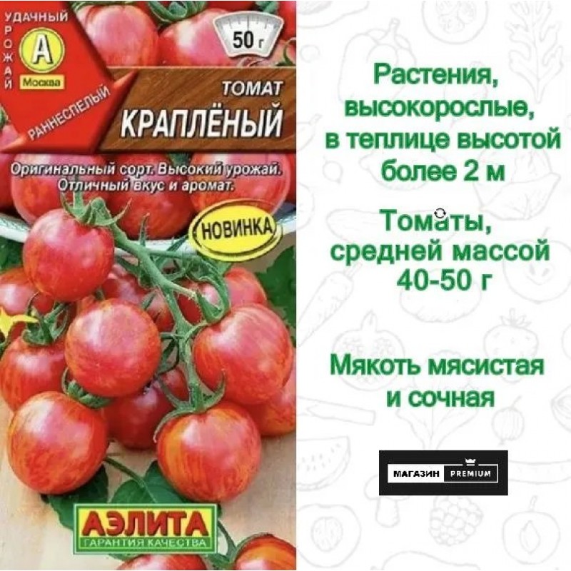 Раннеспелый неприхотливый сорт для теплиц и открытого грунта. От всходов до начала сбора первых плодов 95-110 дней. Растения индетерминантные, высокорослые, в теплице высотой более 2 м. Плоды отличаются оригинальной окраской и в технической, и в биологической спелости. Томаты, средней массой 40-50 г, собраны в кисти по 8-12 штук. Нижние кисти простые, в дальнейшем могут формироваться промежуточные. Мякоть мясистая и сочная, с прекрасным вкусом и томатным ароматом. Сорт отлично подойдет для свежего потребления и цельноплодного консервирования. Урожайность в теплице высокая – 15-17 кг/м2.