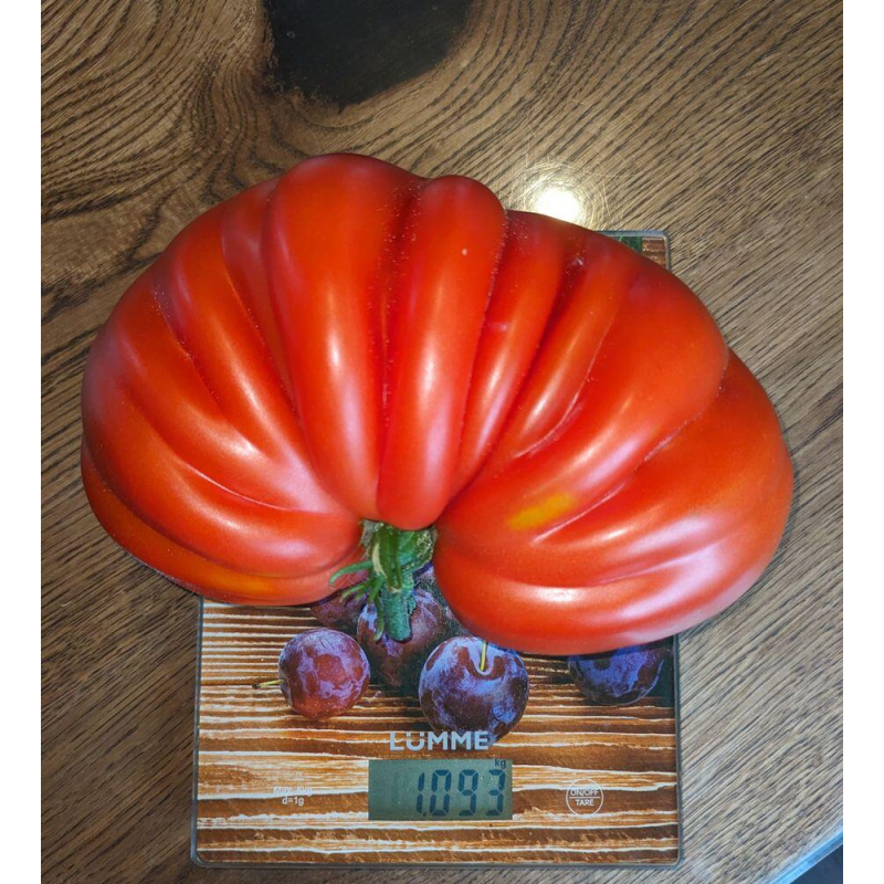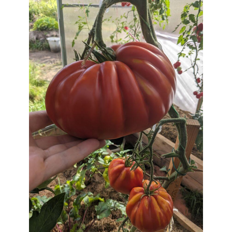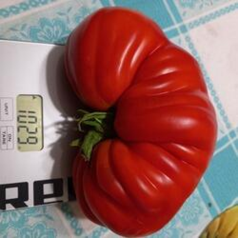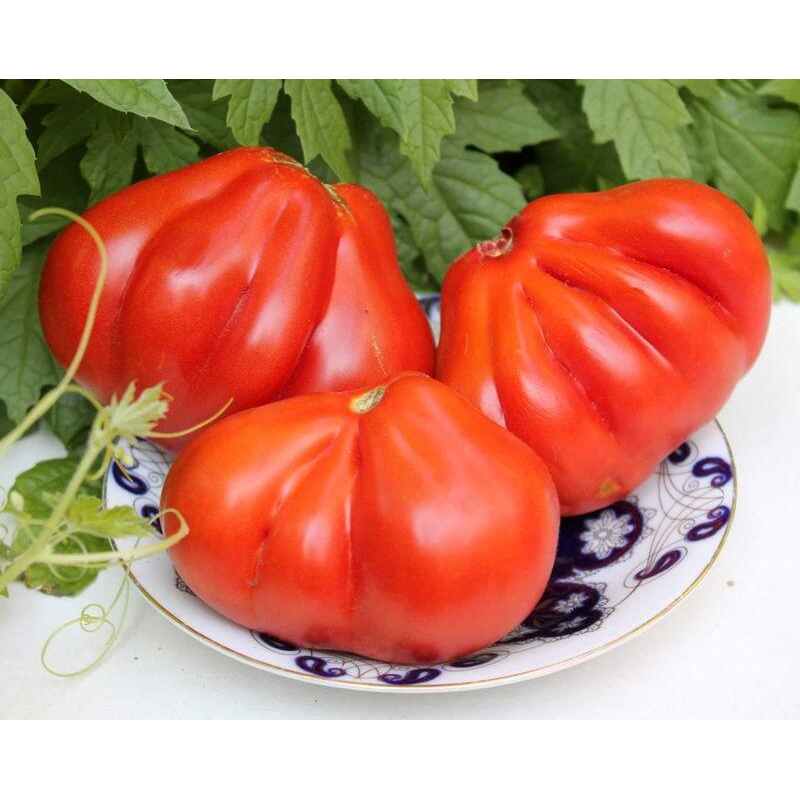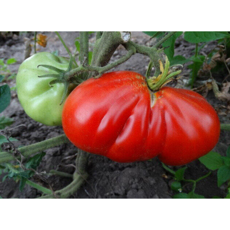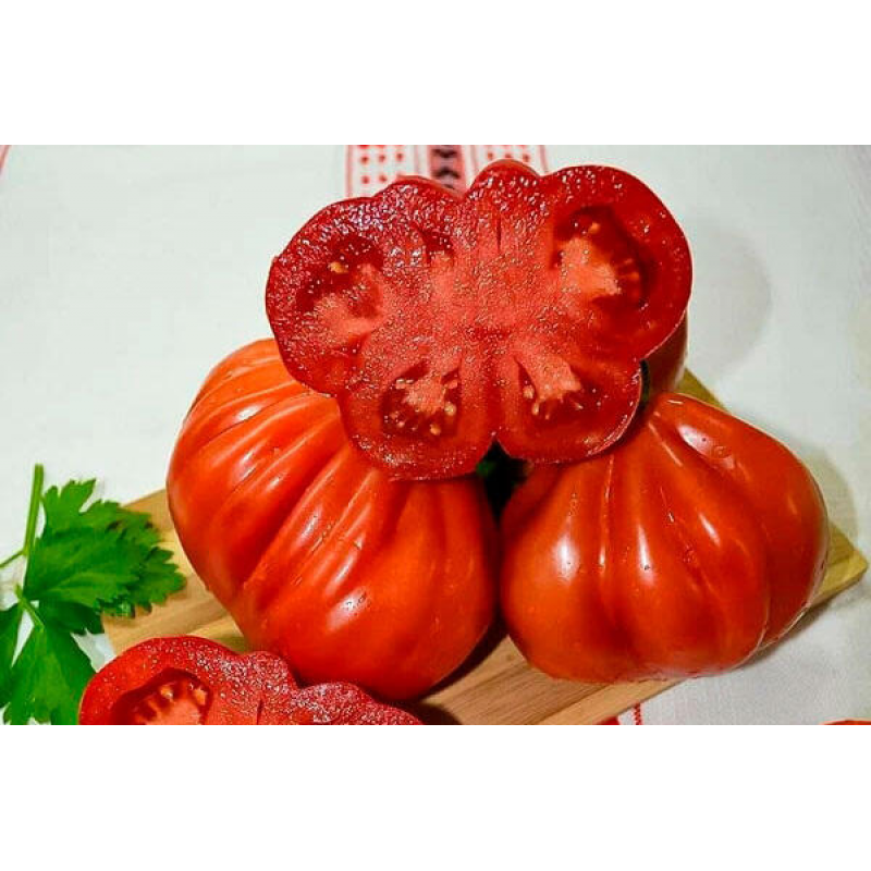 Крупноплодный сорт с оригинальной грушевидно-ребристой формой плодов. Раннеспелый, вступает в плодоношение через 105-110 дней от всходов. Растения индетерминантные, высотой 170-200 см. Плоды мясистые, увесистые, массой 220-300 г, с довольно тонкой кожицей. Мякоть плотная, малосемянная, ароматная, богатая ликопином. Вкус насыщенный, классический помидорный, с преобладанием сладости над кислинкой. Томаты идеально подходят для приготовления салатов, сока, супов, соусов. Продуктивность – до 7 кг с растения. Форма плодов может меняться в зависимости от условий.