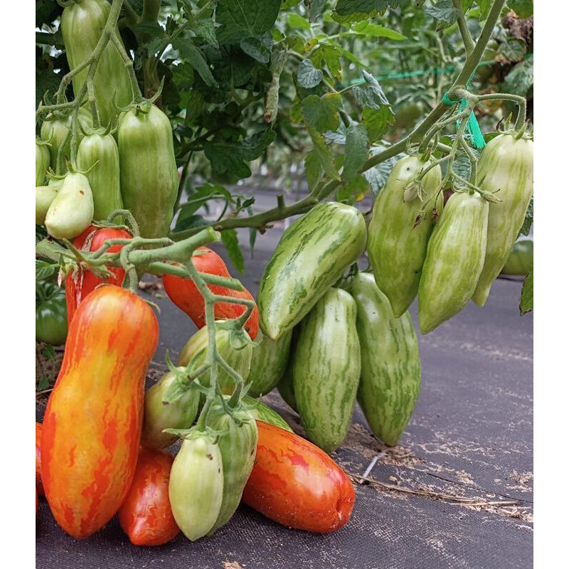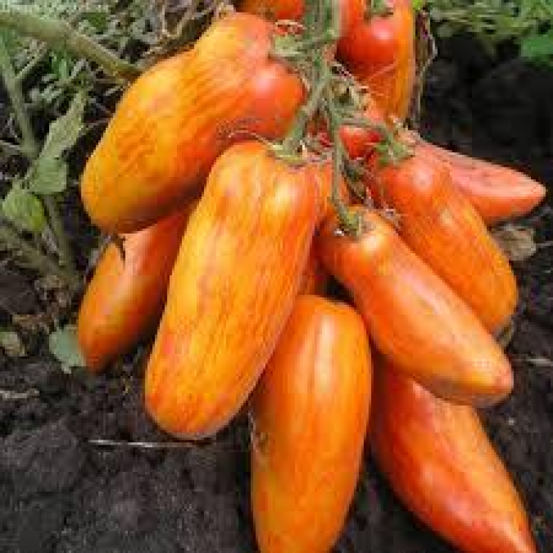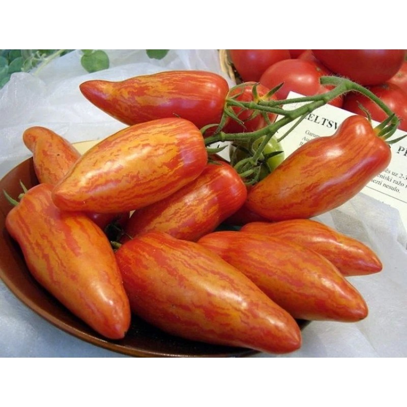 Высокопродуктивный сорт индетерминантного томата с интересной окраской и отменным вкусом плодов. В защищенном грунте формирует щедрый урожай спустя 110-115 дней после появления всходов. Первое соцветие закладывается над 8-9 листом, последующие – через 2 листа. В каждой кисти образуется около 10 завязей. Плоды оранжево-красные, полосатые, двухкамерные, плотные, средней массой – 120 г, длиной 10-12 см. При нормировании числа завязей можно получить более крупные томаты. Мякоть красная, мясистая, сладкая. Сорт отличается устойчивостью к ВТМ, фузариозному увяданию листьев, мучнистой росе. Толерантен к фитофторозу. При хорошем уходе урожайность достигает 14-16 кг/м2.
