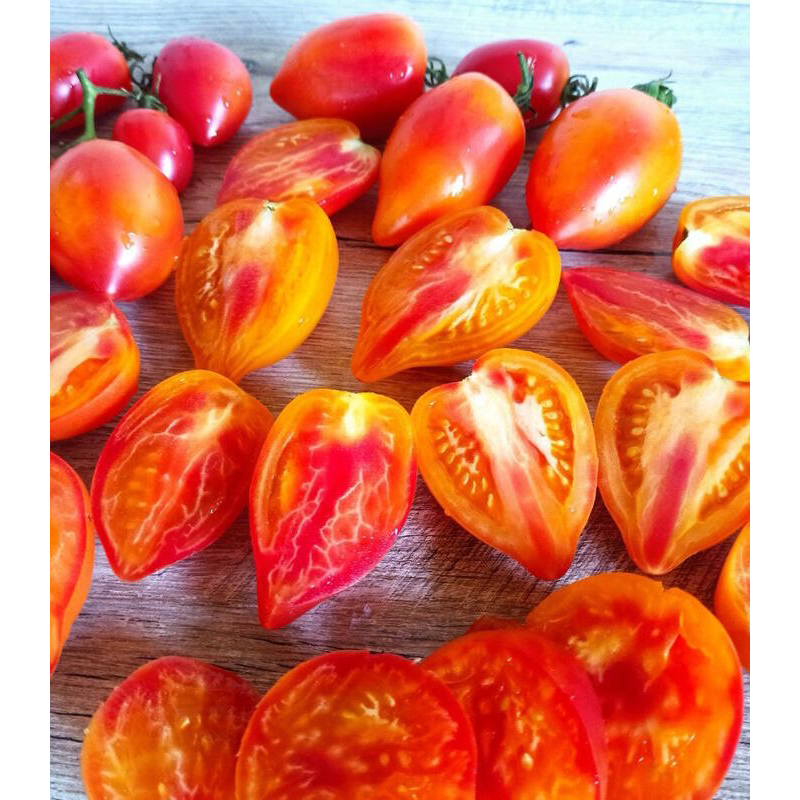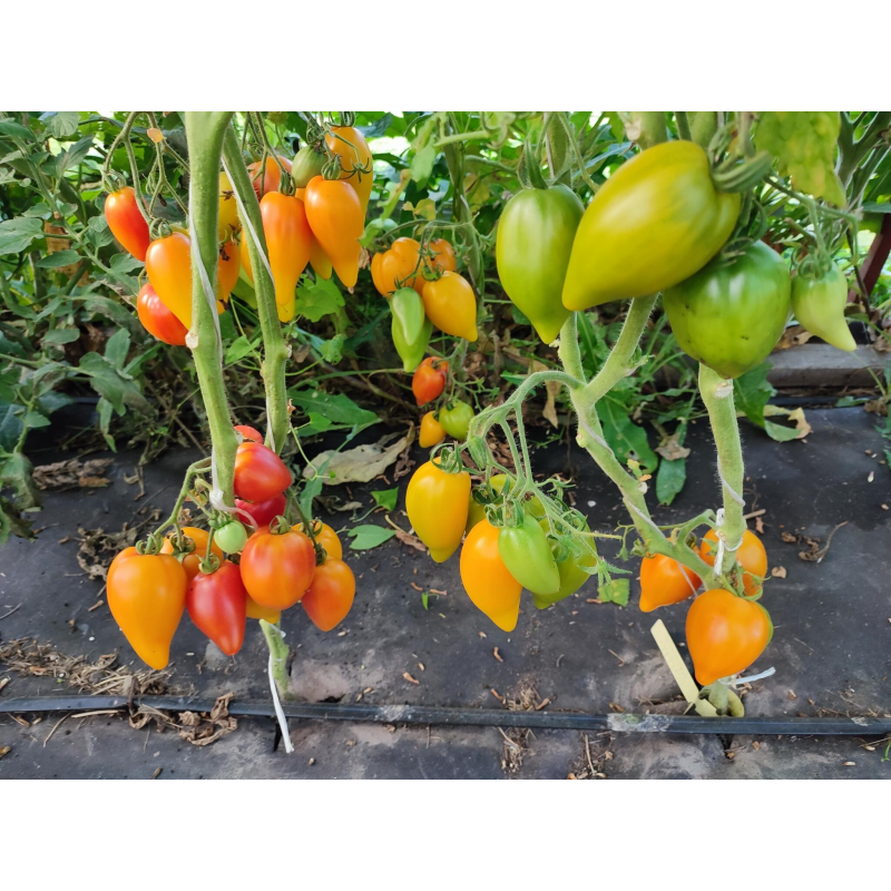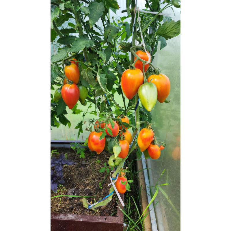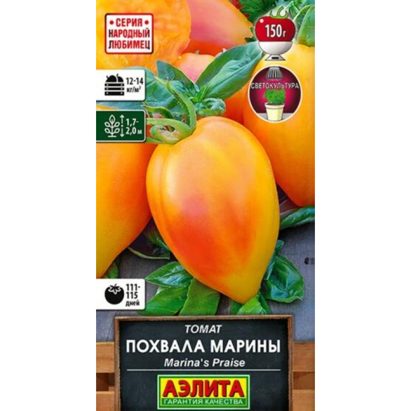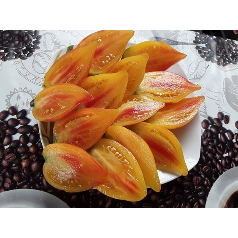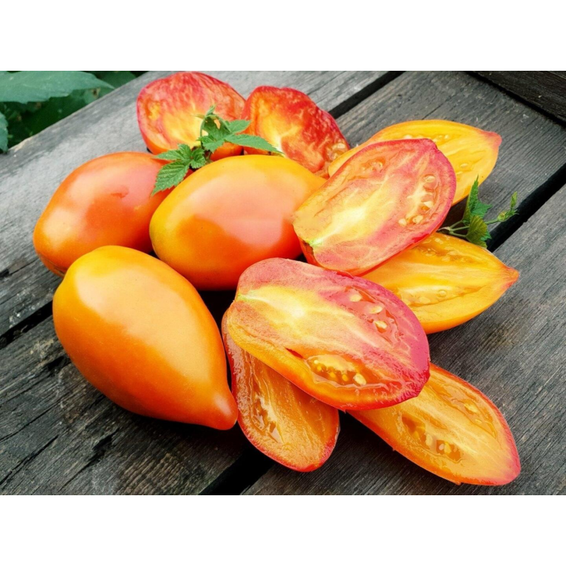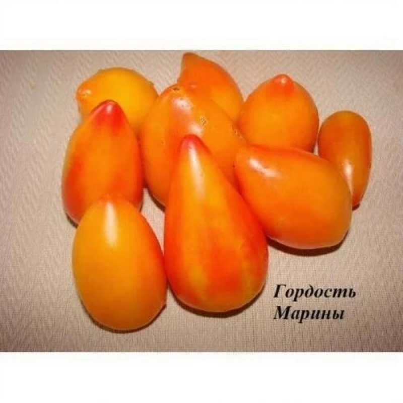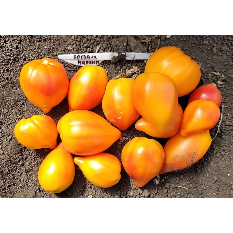 Авторский сорт с уникальной формой и двухцветной окраской плодов от селекционера Джейсона Хейнса (Jason Haynes) США. Второй вариант названия – ”Гордость Марины”. Среднеспелый, от всходов до начала уборки 111-115 дней. Индетерминантный, высота растений в теплице 1,7-2 м. Плоды массой 100-150 г (некоторые до 200 г), сочные, с нежной мякотью. Вкус сладкий, с небольшой кислинкой и фруктовыми оттенками. Они хороши в салатах, сэндвичах, подходят для переработки и консервирования. На стадии рассады листья могут быть с белыми пятнами и штрихами. Собранные плоды хорошо хранятся продолжительное время. Урожайность 12-14 кг/м2. Посев на рассаду: сплошной посев в ящики с пикировкойв фазе 2-3 настоящих листьев или в кассеты 6х6 см, с последующей пересадкой в отдельные горшочки. Растениявыращиваются с формированием в 1-2 стебля, с пасынкованием и круговой подвязкой к шпалере.
