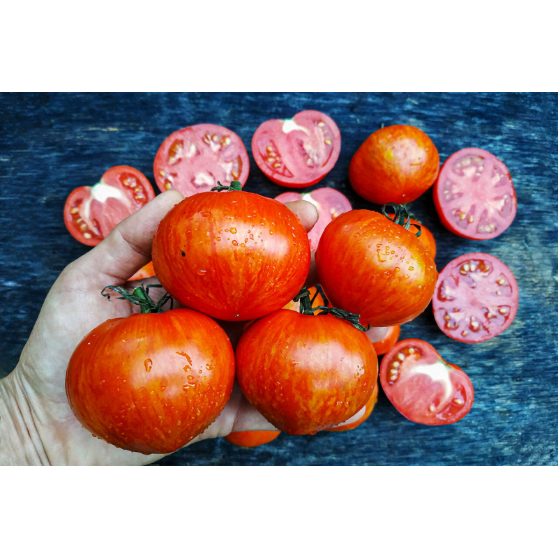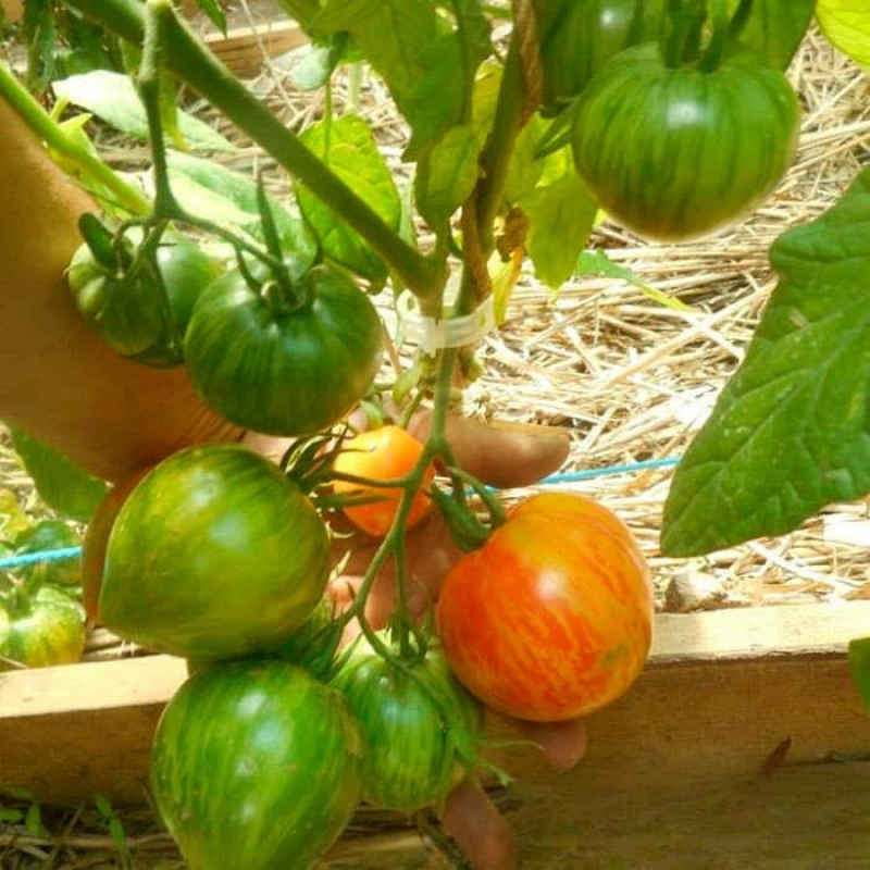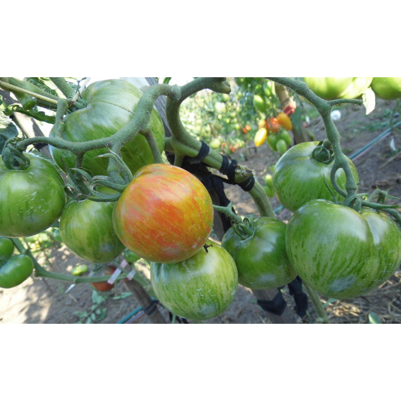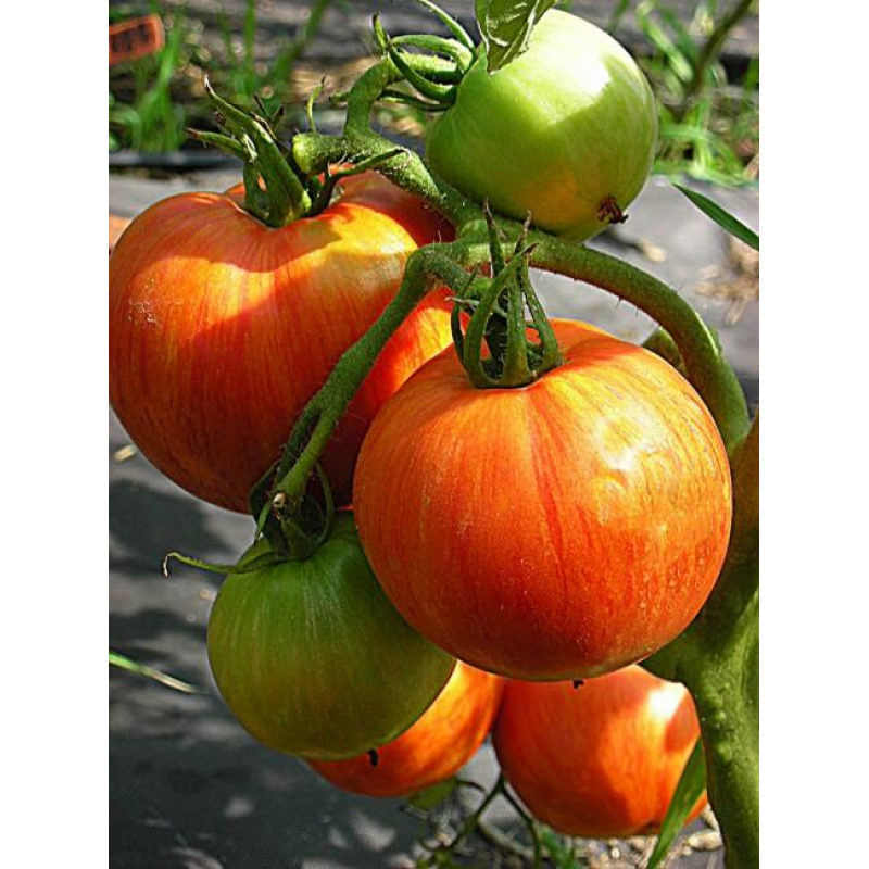 Крупноплодный, салатный сорт с экзотической окраской плодов. Раннеспелый: от появления всходов до созревания урожая 95-105 дней. Растения индетерминантные, высотой 1,8-2,2 м, отлично плодоносят в теплицах. Плоды многокамерные, мясистые, массой 240- 280 г. При нормировании числа завязей вес томата достигает 350 г.