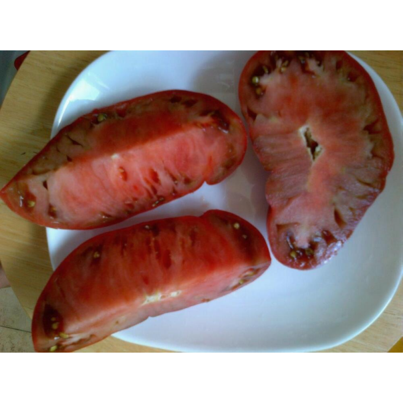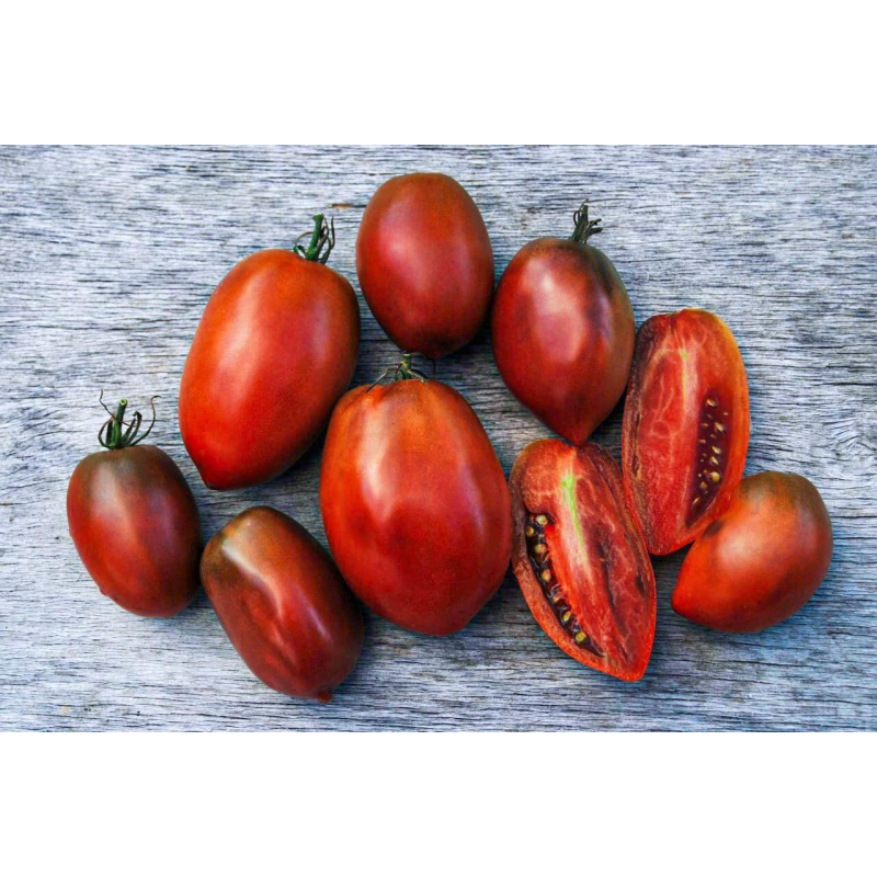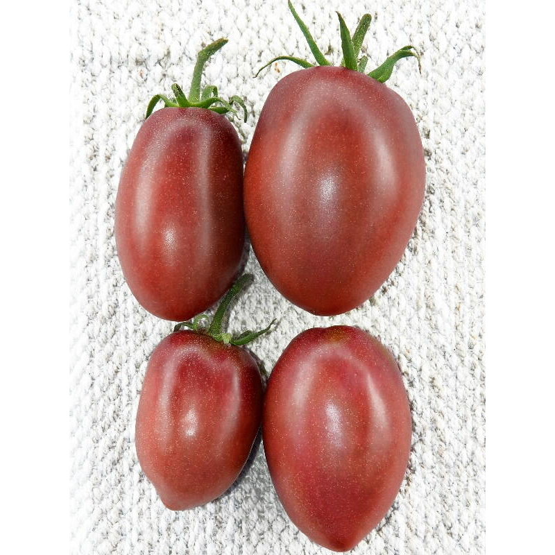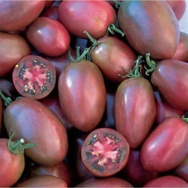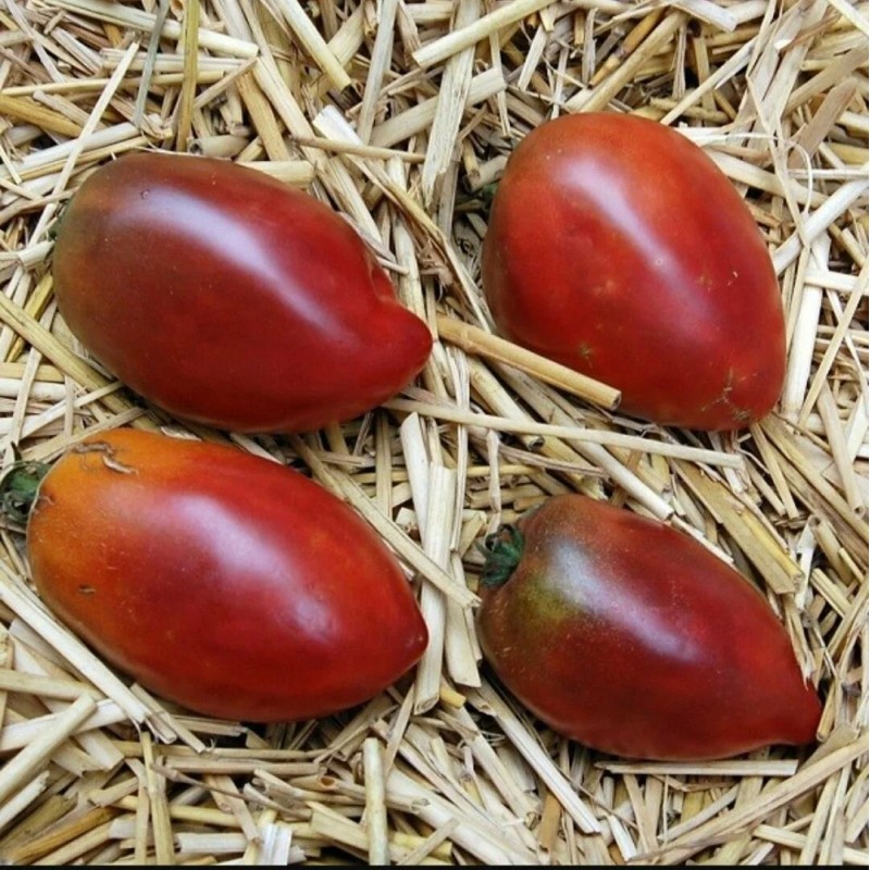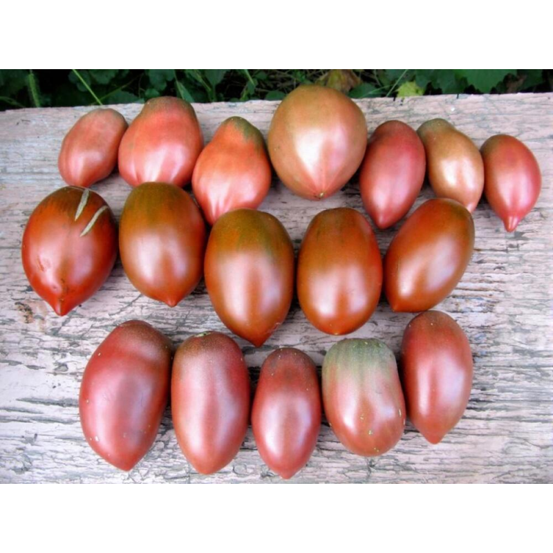 Продуктивный сорт с красивыми и вкусными плодами необычной окраски. В защищенном грунте позволяет получать стабильно высокую урожайность (7-9 кг/м2) в средние сроки, через 110-115 дней после появления всходов. Растения индетерминантные, высотой в теплице 1,8-2,2 м. Томаты сливовидной формы* – отдельные с носиком, плотные, мясистые, среднего размера, массой от 90 до 110 г. Хорошо хранятся и транспортируются. Применяются для свежего употребления и домашних заготовок на зиму.