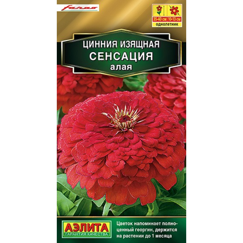 Циннии СЕНСАЦИЯ – результат успешной селекции на очень крупный густомахровый цветок (15 см). Едва ли вы найдете такое же крупное соцветие у других сортов и даже у гибридов. Напоминающий полноценный георгин, эффектный цветок держится на растении свыше месяца. Крепкий раскидистый куст 35-40 см высотой красиво смотрится в одиночных посадках и в компании других летников в среднем ярусе миксбордера. Букеты из цинний СЕНСАЦИЯ долго стоят в воде и, несомненно, сорт будет интересен профессиональным срезочникам.