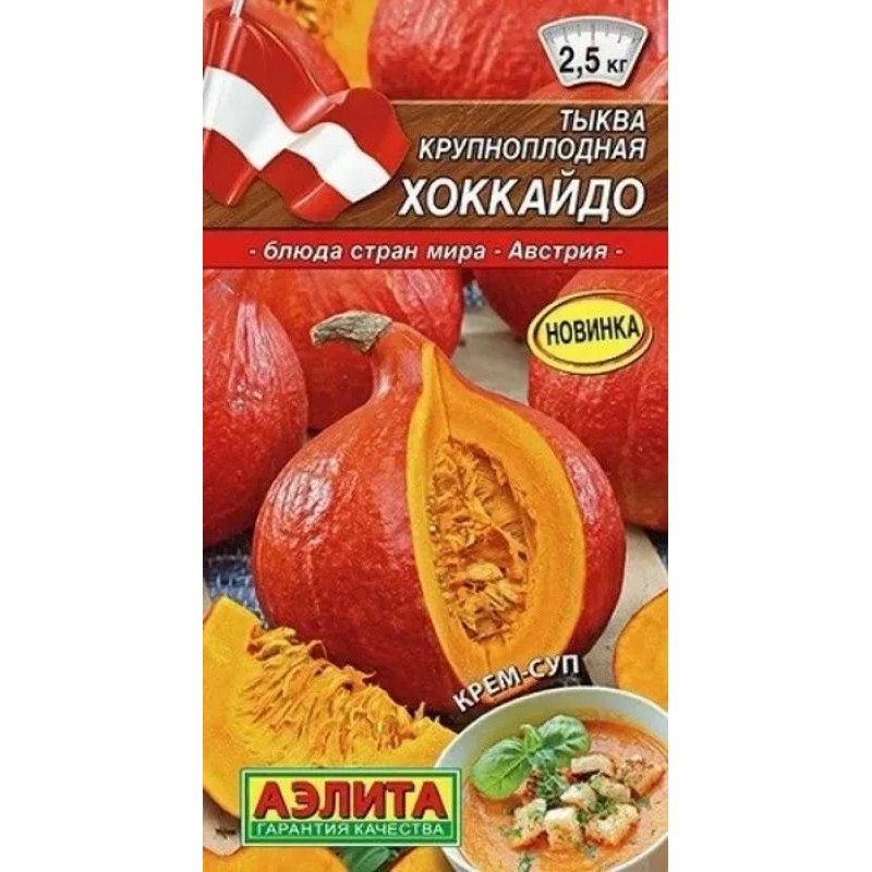 Сорт Хоккайдо известен среди садоводов, благодаря ореховому аромату и широкому применению в кулинарии. Период созревания средний – 100-110 дней. Плоды небольшие порционные, массой 2-2,5 кг. Сладкая мякоть с приятным вкусом богата каротином и множеством других полезных веществ. Сорт может использоваться, как горшочек для супа, любого гарнира с мясом и грибами. Тыкву запекают в духовке и кушают в сыром виде. Урожайность – 4-5 кг/м2.