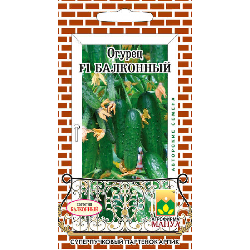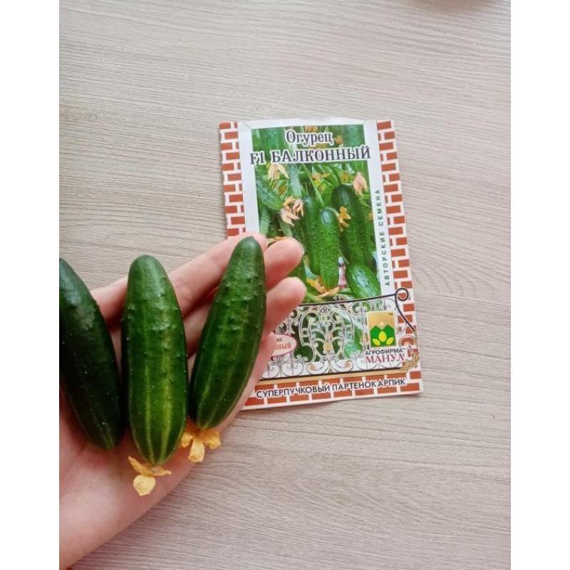 F1 Балконный – партенокарпический суперпучковый корнишон женского типа цветения. Ветвление среднее или выше среднего. Характеризуется длительным и стабильно высоким плодоношением. В узлах формируется от 2-4 до 6-8-10 и более завязей, налив завязей в узле последовательный. Зеленцы бугорчатые, белошипые, длиной 8-10 см. Когда нагрузка завязями и зеленцами высокая, зеленцы долго не перерастают, остаются некрупными. Частота расположения бугорков средняя. Консервные и засолочные качества высокие. Гибрид устойчив к оливковой пятнистости, вирусу обыкновенной огуречной мозаики, мучнистой росе, толерантен к ложной мучнистой росе.