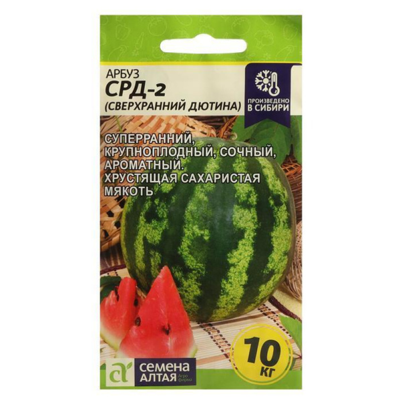 Сорт ультраскороспелый. От всходов до созревания 55-60 дней. Плоды удлиненно-округлые, массой 4-5 кг. Поверхность плода гладкая, слаборебристая, с узкими темно-зелеными шиповатыми полосами на светло-зеленом фоне. Кора толстая, твердая. Мякоть красная, сочная, сладкая. Транспортабельность высокая, лежкость средняя. Сорт устойчив к слабовирулентным расам антракноза, вынослив к мучнистой росе и бахчевой тле. Рекомендуется для возделывания на поливе, подходит для выращивания в защищенном грунте. Урожайность при орошении 30-35 т/га.