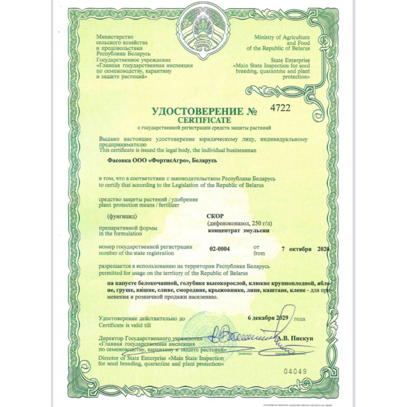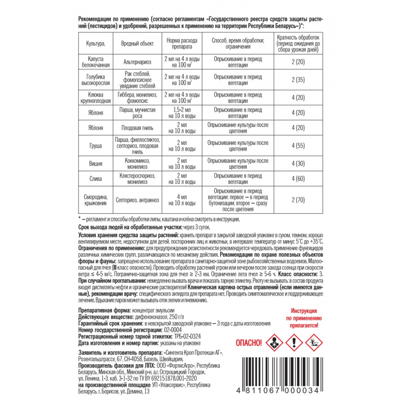 СКОР — непревзойденный системный препарат для защиты плодовых культур и косточковых от комплекса болезней, а также многих декоративных культур от различных пятнистостей. Так фунгициды рекомендуется чередовать Топаз, Скор и Свитч, а также с другими системными фунгицидами исходя из задач по защите растений Дискор, Импакт, Раёк, Скор, Фитолекарь, Фаворит, Фитолавин, Фундазол, Хорус. Препарат имеет чрезвычайно сильное лечебное (5 суток) и профилактическую (8–10 суток) действие против возбудителей болезней. Для яблони и груши (от парши, мучнистой росы и альтернариоза) Для персика, абрикоса и сливы (от клястероспориоза и курчавости листьев) Для вишни и черешни (от коккомикоза) Для цветочных растений (от мучнистой росы и серой гнили) Для роз (от мучнистой росы и черной пятнистости) Для декоративных кустарников (от мучнистой росы и пятнистостей) Для томатов открытого грунта, картофеля и моркови (только для С/Х) Для винограда (только для С/Х) СКОР быстро (в течение 30 минут) проникает в растение и проявляет биологическую активность независимо от погодных условий. Биологическая активность препарата позволяет сохранить зеленый лист до поздней осени, благодаря чему большое количество пластических веществ накапливается в почках и плодах, обеспечивается дополнительное количество (30 % и более) плодовых почек, что, в свою очередь, увеличивает урожай следующего сезона. СКОР малотоксичен, безопасен для людей и окружающей среды (ЛД > 2000 мг/кг). Преимущества: -Высокоэффективная защита плодов и листьев даже при высоком инфекционном фоне. -Важный препарат для чередования -Самый надежный и эффективный -Гибкие сроки применения (розовый бутон, начало цветения, цветение, завязь, рост плодов). -Допускаются обработки в период цветения. -Благоприятные экотоксикологические характеристики. Фасовка - РБ, по заказу Агромаркет