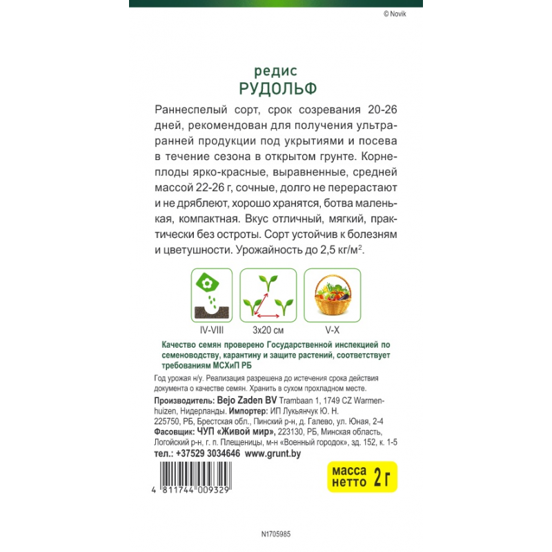 Раннеспелый сорт, срок созревания 20-26 дней, рекомендован для получения ультраранней продукции под укрытиями и посева в течение сезона в открытом грунте.
