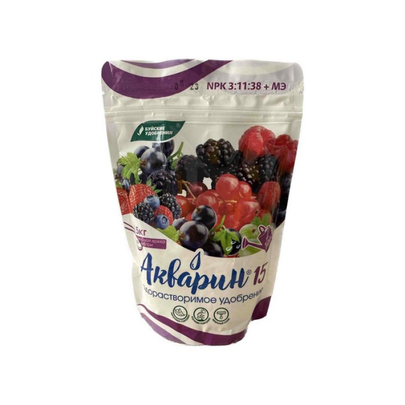 Удобрение для плодово-ягодных Акварин 15 - водорастворимое удобрение. Благодаря кислой реакции (рН) удобрения, оно легко растворяется в холодной воде и более эффективно усваивается корневой системой или листовой поверхностью растений. Удобрение предназначено для подкормок поливом или опрыскиванием любых цветочно-декоративных культур в течение всей вегетации. При совместном использовании со средствами защиты растений снимает стрессовое воздействие ядохимикатов на растения.