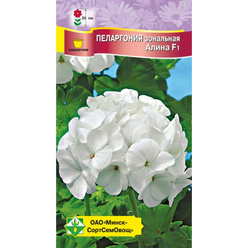 Популярное растение высотой до 35 см. Белоснежные цветки собраны в большие шаровидные соцветия. Листья зеленой окраски с более темным оттенком по краю. При хорошем уходе может цвести почти круглый год. Является классическим растением для балконов, подоконников, подвесных корзин. На второй год после посева с июня по сентябрь послужит украшением любого цветника в саду. Практически не поражается вредителями и болезнями.Качество семян соответствует ГОСТу 12420-81 и Постановлению МСХП РБ от 29.10.2015г. №37.