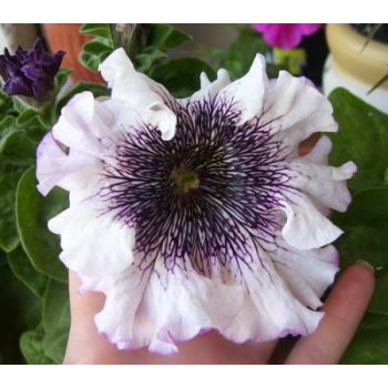 Однолетнее продолжительно цветущее растение с побегами длиной около 50 см. Цветки крупные, с волнистыми бахромчатыми краями, нежно-фиолетовой окраски с темно окрашенным рисунком в середине, в диаметре 12-14 см. Идеальна для посадок в балконных ящиках, горшках и кашпо, можно использовать в цветниках. При посеве семена не присыпают, а слегка вдавливают в почву. Для показа всего своего великолепия этим петуниям необходимо солнце, регулярные подкормки и достаточное увлажнение.Качество семян соответствует ГОСТу 12260-81 и Постановлению МСХП РБ от 29.10.2015г. №37.