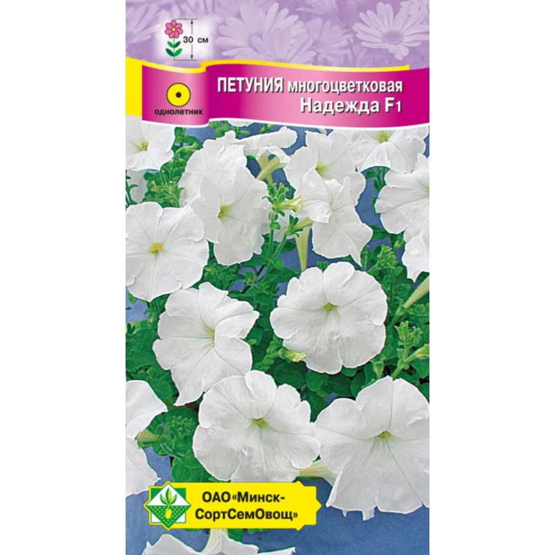 Обильно и продолжительно цветущее однолетнее растение высотой около 30 см. Цветки роскошной белой окраски, в диаметре 6-7 см. Прекрасно смотрится на клумбах, газонах, в балконных и оконных вазах. Посев на рассаду производят в конце марта - начале апреля. Семена не присыпают, а слегка вдавливают в рыхлую влажную почву, посадочную ёмкость накрывают стеклом или плёнкой. В открытый грунт рассаду высаживают с середины мая. Устойчива к неблагоприятным погодным условиям.Качество семян соответствует ГОСТу 12260-81 и Постановлению МСХП РБ от 29.10.2015г. №37.