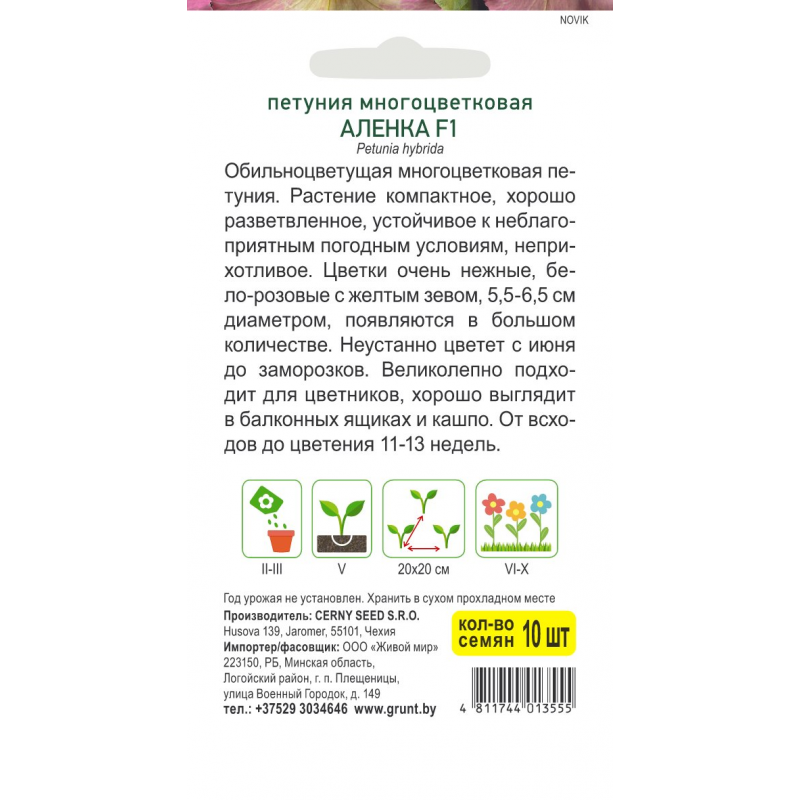 Неустанно цветет с июня до заморозков. Великолепно подходит для цветников, хорошо выглядит в балконных ящиках и кашпо. От всходов до цветения 11-13 недель.