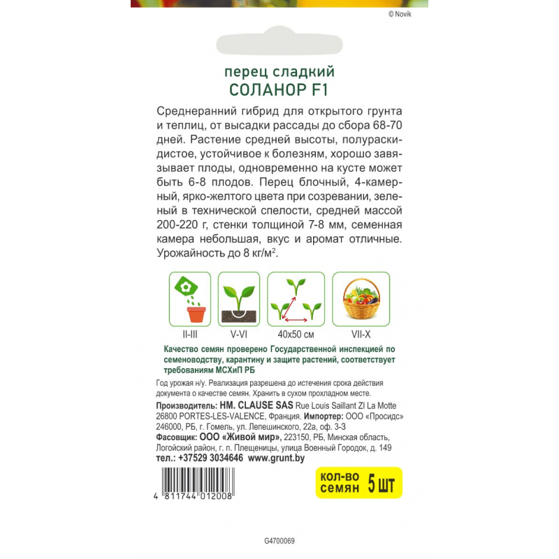 Перец блочный, 4-х камерный, ярко-желтого цвета при созревании, зеленый в технической спелости, средней массой 200 - 220 г, стенки толщиной 7 - 8 мм, семенная камера небольшая, вкус и аромат отличные.