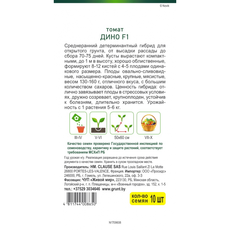 Среднеранний детерминантный Гибрид для открытого грунта, от высадки рассады до сбора 70-75 дней. Кусты вырастают компактными, до 1 м в высоту, хорошо облиственные, формируют 8-12 кистей с 4-5 плодами одинакового размера. Плоды овально-сливовидные, насыщенно-красные, крупные, мясистые, весом 130-160 г, отличного вкуса с большим количеством сахаров. Ценность гибрида: отлично завязывает плоды в стрессовых условиях, дружно созревает, крупноплоден, устойчив к болезням, длительно хранится. Урожайность с 1 растения 5-6 кг.