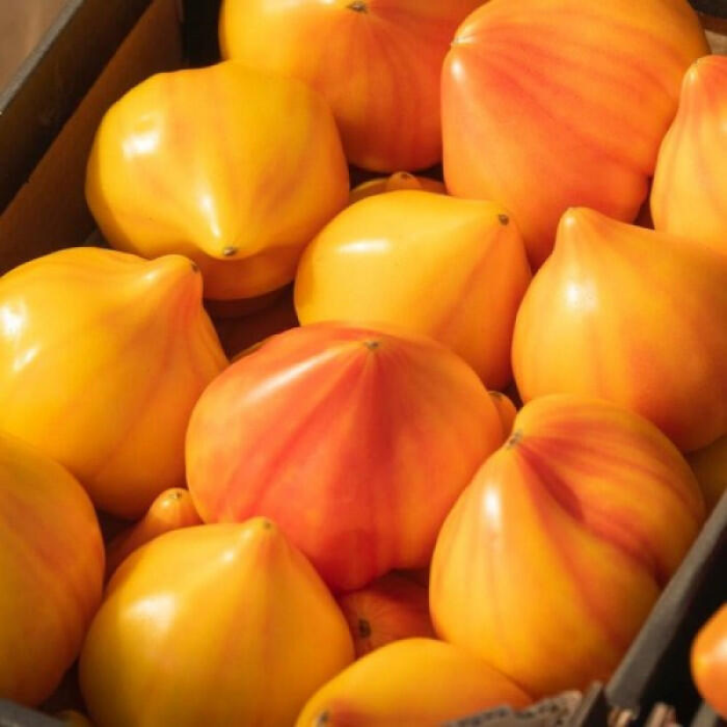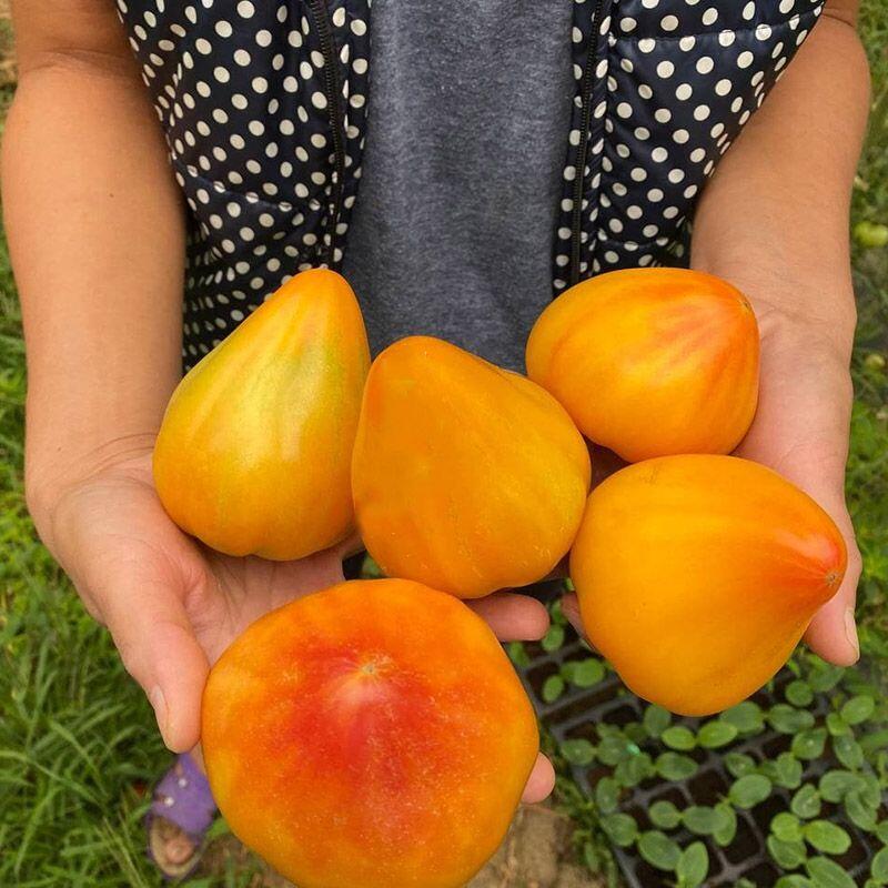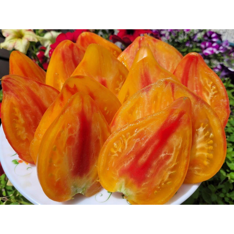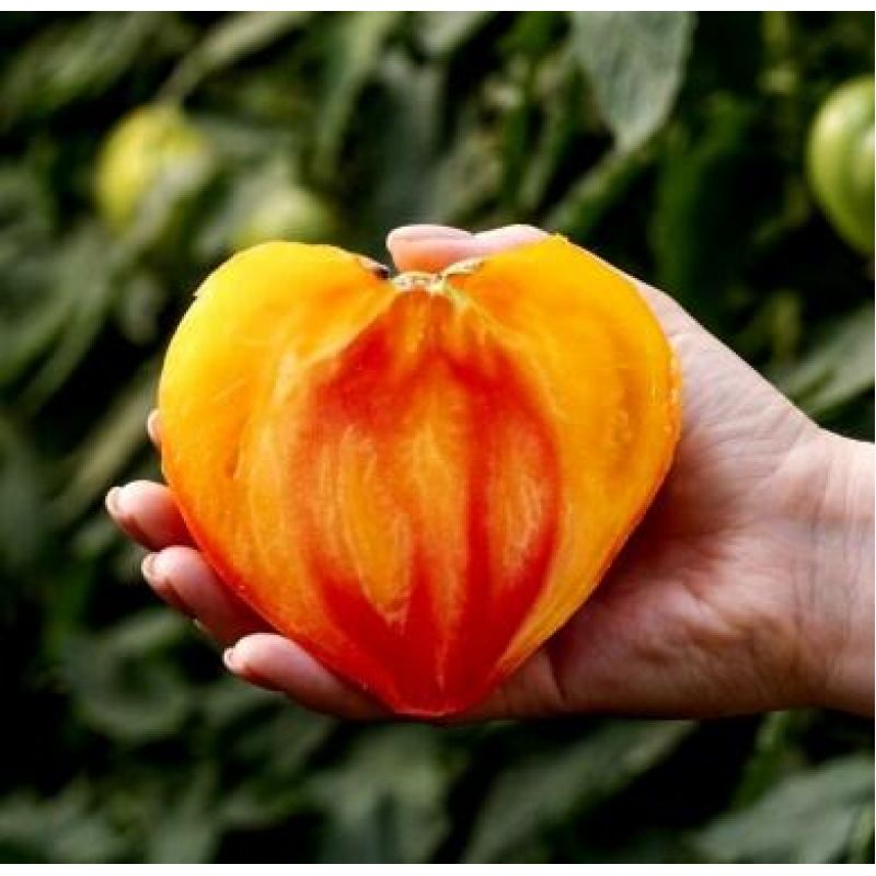 Плоды сердцевидные, слегка ребристые, при созревании желтые с красными вкраплениями, многокамерные, очень крупные, 350 - 400 г, могут достигать 700 г. Мякоть желтая, с красными прожилками, сладкая и нежная, сахаристая, с малым количеством семян, очень вкусная.