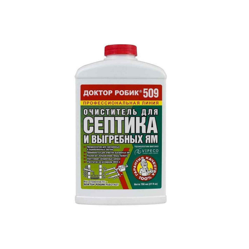 "description": "Биоактиватор Доктор Робик 509 (798мл) – готовый раствор для септиков и выгребных ям. Эффективно разжижает густые массы, окаменелости и очищает поры в грунте. Восстанавливает работу канализационных и дренажных систем за короткое время. Один флакон (0.798 л) рассчитан на объем до 3000 литров. Содержит ферменты, суспензию бактериальных спор, ПАВ и грибные ферменты. Пластиковый белый флакон с красной крышкой и предохранительной мембраной.",
