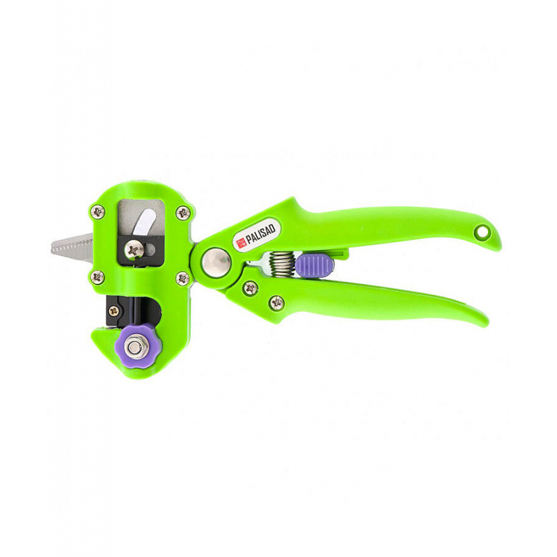 Прививочный секатор PALISAD 60502 предназначен для точной прививки растений. Общая длина инструмента 21 см. Максимальный диаметр среза составляет 10 мм. Рабочая часть изготовлена из прочной стали, рукоятки выполнены из пластика. Оснащен храповым механизмом и рычажной системой для увеличения усилия реза.