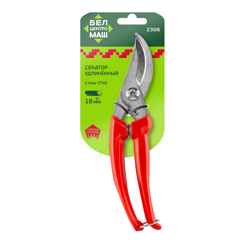 Секатор ЦИ Белцентромаш 2306 — плоскостной садовый инструмент для точного среза. Режет ветви до 18 мм в диаметре. Оснащен храповым механизмом и рычажной системой для легкого усилия. Рукоятки из прочного пластика, режущая часть выполнена из высококачественной стали 45. Произведен в России компанией ЦИТ ООО. Вес: 0.15 кг.