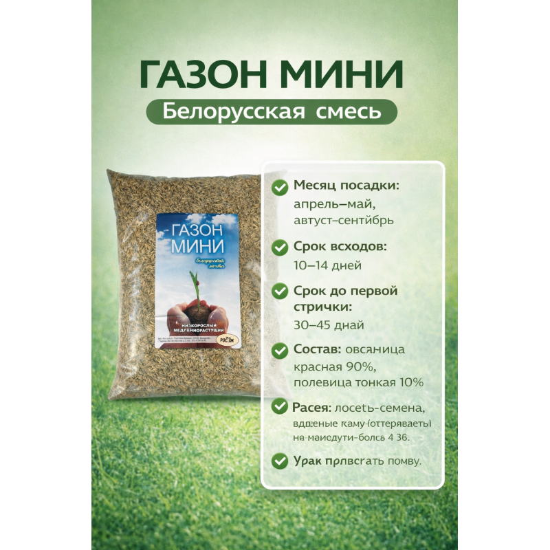 Газон Мини, 300 г — низкорослая газонная травосмесь для создания аккуратного и медленнорастущего газона. Смесь подходит для посева на даче, приусадебном участке, возле дома и в зонах, где нужен красивый зеленый газон без слишком частого скашивания. Состав: овсяница красная (Пяшчотная) — 90%, полевица тонкая (Хайленд) — 10%. Расход составляет 30 г на 1 м², упаковки 300 г хватает примерно на 10 м².