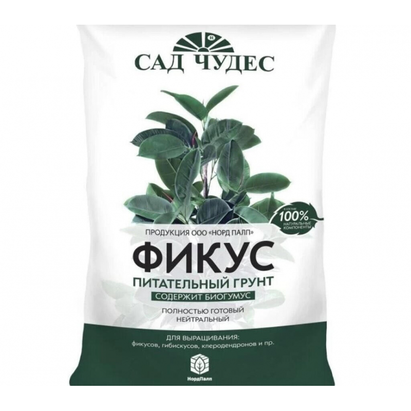Грунт САД ЧУДЕС Фикус питательный — полностью готовый субстрат высокой плотности с нейтральной кислотностью (pH 6.5), специально разработанный для комнатных декоративных растений семейства вербеновых, таких как фикусы, гибискусы и клеродендроны. Изготовлен из смеси качественных верховых торфов, обогащён биогумусом для естественной стимуляции роста, очищенным речным песком для улучшения структуры почвы и комплексным минеральным удобрением, обеспечивающим сбалансированное питание. Уникальная добавка мраморного отсева повышает концентрацию кальция в грунте, что способствует здоровому развитию растений. Объём упаковки — 2.5 литра.