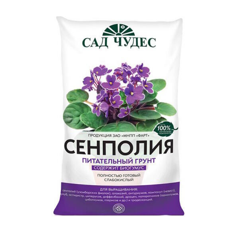 Грунт САД ЧУДЕС Сенполия — полностью готовый питательный субстрат для требовательных комнатных растений. Имеет слабокислую реакцию (pH 5.5–6.5), близкую к нейтральной, что идеально подходит для сенполий (узамбарских фиалок), алоказий, антуриумов, кампанул, драцен, папоротников и других декоративно-лиственных культур. Грунт рыхлый, воздухопроницаемый, благодаря повышенному содержанию агроперлита, что обеспечивает оптимальный водно-воздушный баланс для корневой системы. Сбалансированный состав (азот — 120 мг/л, фосфор — 180 мг/л, калий — 280 мг/л) обеспечивает растения основными элементами питания, стимулирует здоровый рост и развитие. Объем упаковки — 2.5 л.