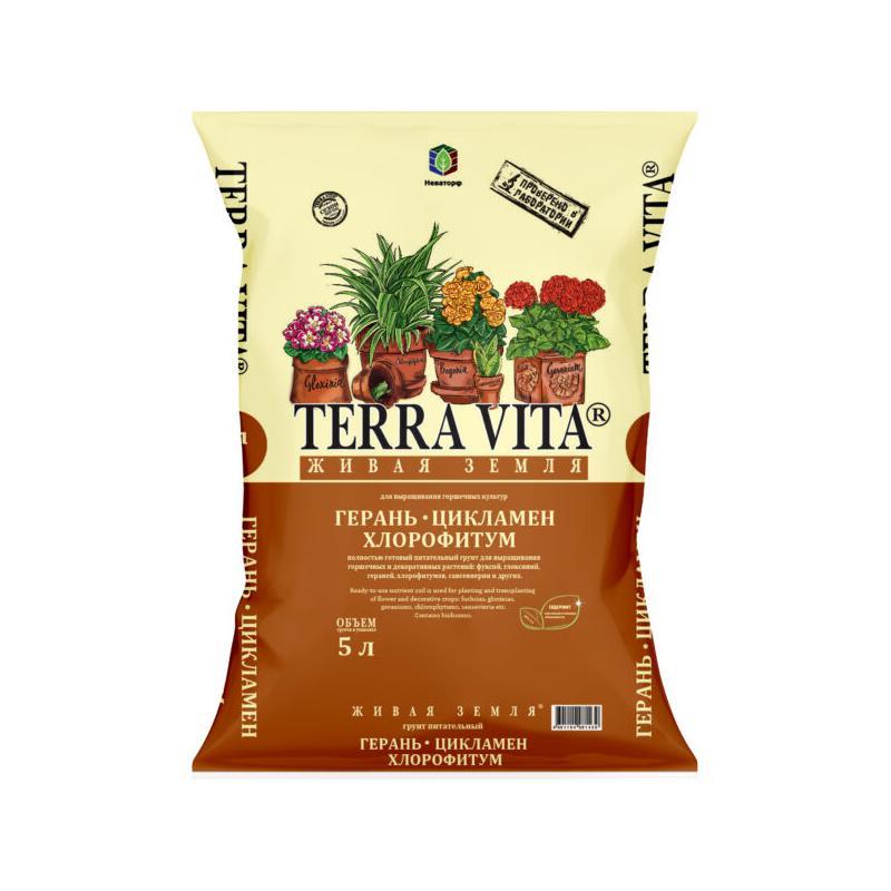 Грунт TERRA VITA ЖИВАЯ ЗЕМЛЯ — полностью готовый питательный субстрат для выращивания горшечных и декоративных растений. Идеально подходит для гераней (пеларгоний), цикламенов, хлорофитумов, а также для фуксий, глоксиний, аспарагусов, кливий, плющей, фатсий, сансевиерии и других культур. Произведён из смеси торфов различной степени разложения с добавлением песка, известняковой муки, микроэлементов и биогумуса. Оптимизирует влаго- и воздухообмен, способствует развитию корневой системы и стимулирует здоровый рост растений. Может использоваться как основной грунт для посадки и пересадки, а также в качестве подкормки или для досыпки при усадке почвы. Кислотность (pH 5.5) благоприятна для большинства комнатных растений. Объём упаковки — 5 литров.