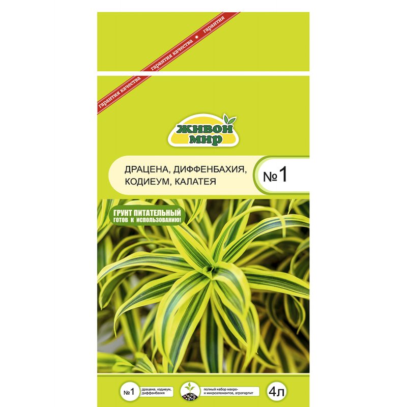 Высококачественный, полностью готовый к применению специальный грунт для выращивания следующих растений: драцена, диффенбахия, кодиеум, калатея, плющ, аглаонема, кордилина, радермахера, аспарагус, хлорофитум, нолина, гинура, маранта, строманта, аспидистра, традесканция. Грунт содержит комплекс макро- и микроэлементов, обеспечивающих полноценное питание и развитие растений.