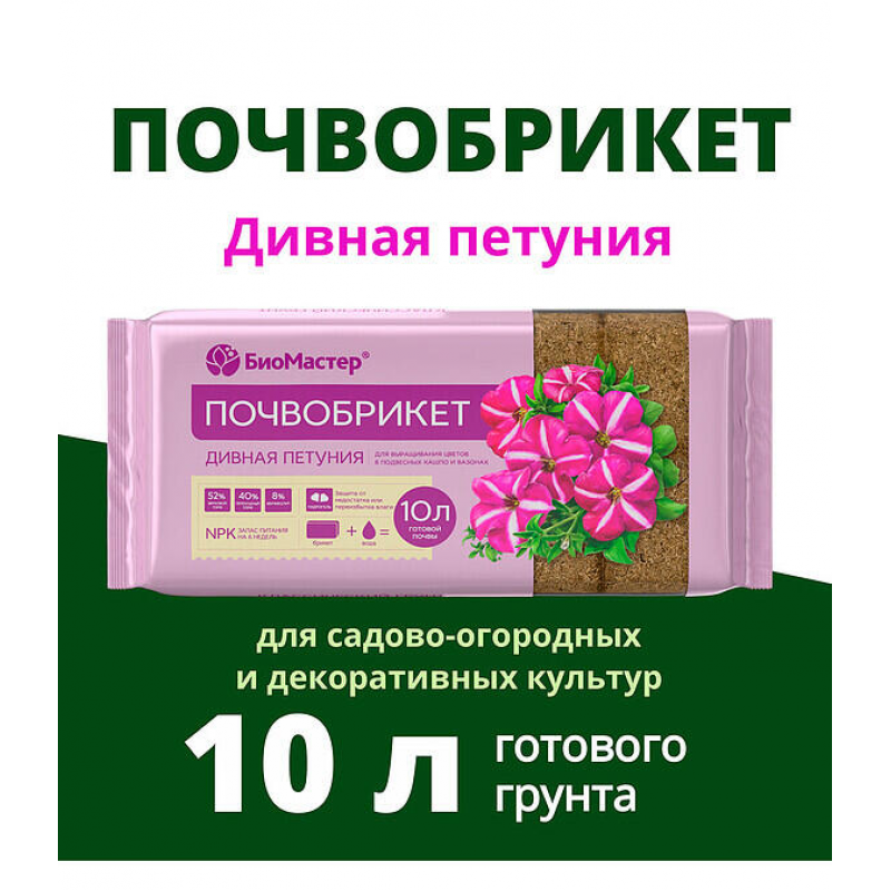 Почвобрикет БиоМастер 'Дивная петуния' с гидрогелем — это готовый к использованию питательный грунт, специально разработанный для выращивания пышных и ярких петуний. В его состав входит сбалансированная смесь верхового и переходного торфа (92%), которая обеспечивает оптимальную кислотность (pH 5-6.8), идеальную для цветочных культур. Добавление вермикулита (8%) и гидрогеля оптимизирует влаго- и воздухообмен в почве, создавая комфортные условия для корневой системы. Гидрогель накапливает влагу и постепенно отдает её растениям, что позволяет увеличить интервалы между поливами и защитить цветы от пересыхания. Комплексное удобрение, включенное в состав, способствует активному росту, улучшению внешнего вида и продолжительному, обильному цветению петуний. Объем упаковки — 10 литров, вес — 0.75 кг. Продукт произведен в России компанией 'Терра Мастер'.