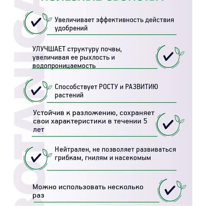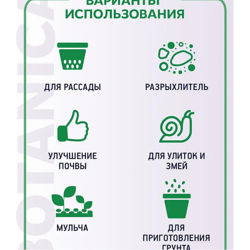 Чистый органический материал без примесей; улучшает структуру почвы, повышая рыхлость и водопроницаемость; способствует росту и развитию растений; нейтрален, устойчив к грибкам, гнилям и насекомым; сохраняет свойства до 5 лет; универсален для комнатных растений, рассады и террариумов