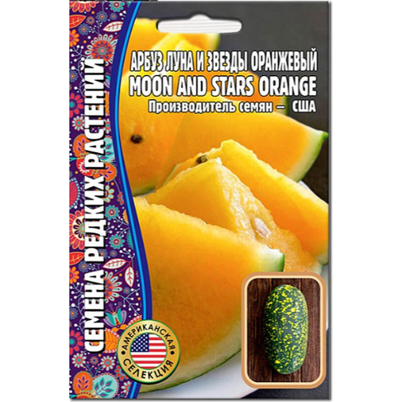 Арбуз Луна и звезды оранжевый - потрясающая семейная реликвия американской селекции, редкий и очень красивый крупноплодный сорт. Плоды отличаются эллиптической формой и уникальной окраской: тёмно-зелёная кора покрыта ярко-жёлтыми пятнышками, напоминающими ночное небо с Луной и звёздами, что и дало название сорту. Мякоть имеет насыщенный жёлто-оранжевый цвет, отличается сочностью и исключительной сладостью. Средний вес плодов составляет 7-18 кг, что делает этот сорт одним из самых крупноплодных. Толстая кожура обеспечивает отличную лёжкость, позволяя хранить арбузы в прохладном месте на протяжении всей зимы. Сорт среднеспелый, срок созревания 85-90 дней, идеально подходит для выращивания в различных климатических условиях. Эти семена представляют собой уникальную возможность вырастить на своём участке настоящую экзотику с потрясающими декоративными и вкусовыми качествами.