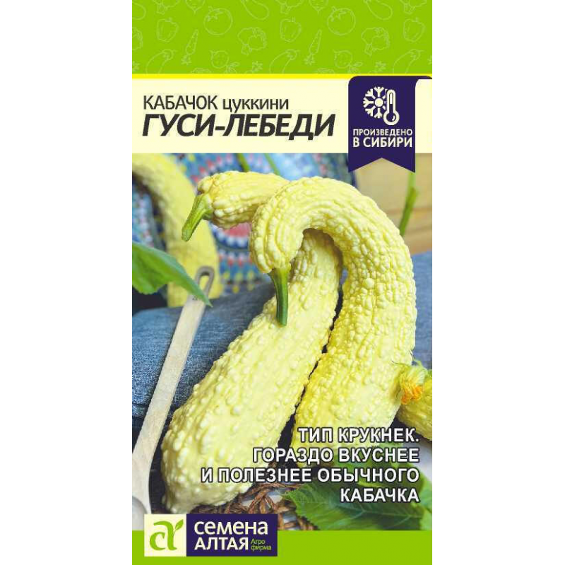 Кабачок Гуси-Лебеди - оригинальный сорт типа "крукнек" (скрученная шея) от компании "Семена Алтая". Среднеспелый сорт с периодом от всходов до технической спелости 60-65 дней. Растение кустовое, компактное, что делает его идеальным для небольших участков. Плоды имеют уникальную удлиненно-цилиндрическую форму с характерным утолщением на цветочном конце, поверхность бугорчатая, окраска ярко-желтая. Средняя масса плодов составляет 1,5-2,0 кг. Мякоть светлая, сочная, очень нежная и обладает превосходными вкусовыми качествами. По содержанию питательных веществ этот сорт превосходит другие виды кабачков. Сорт отличается высокой урожайностью и устойчивостью к неблагоприятным условиям. Идеально подходит для выращивания в различных регионах благодаря своей адаптивности. Пакетик содержит 1 грамм семян, что обеспечивает достаточное количество посадочного материала для получения обильного урожая.